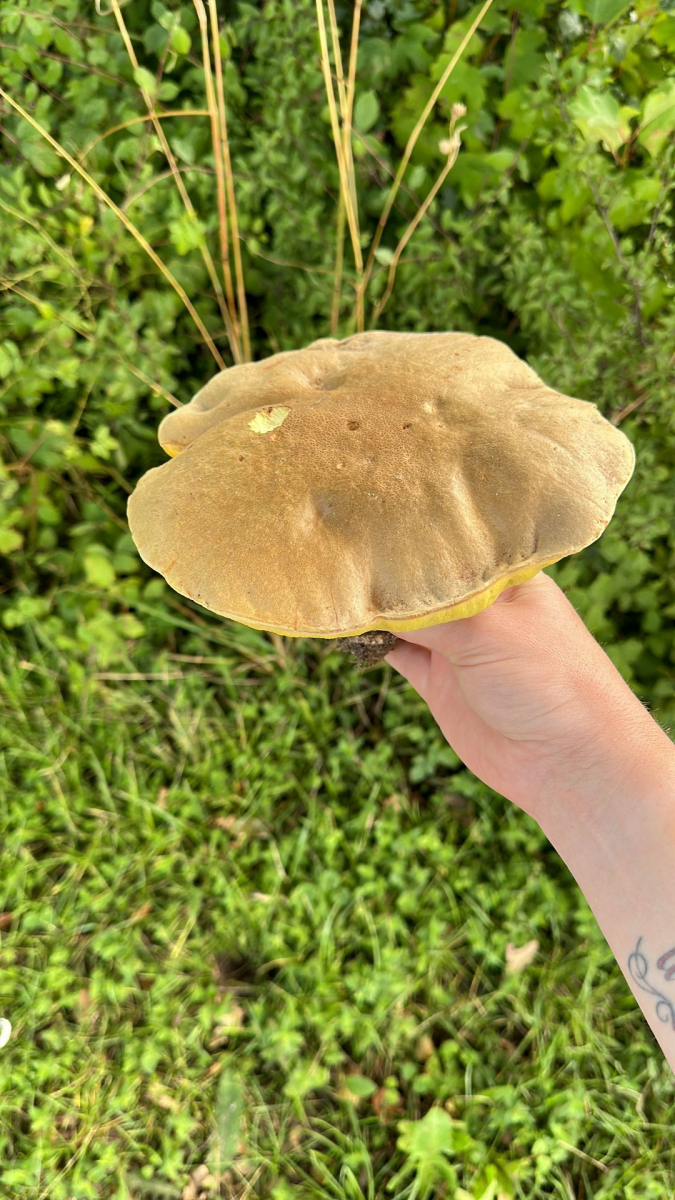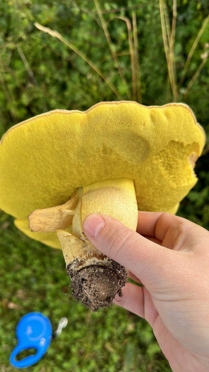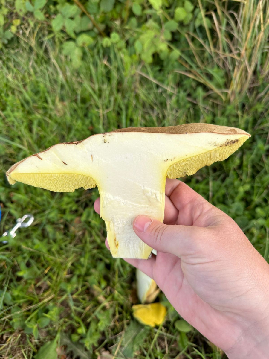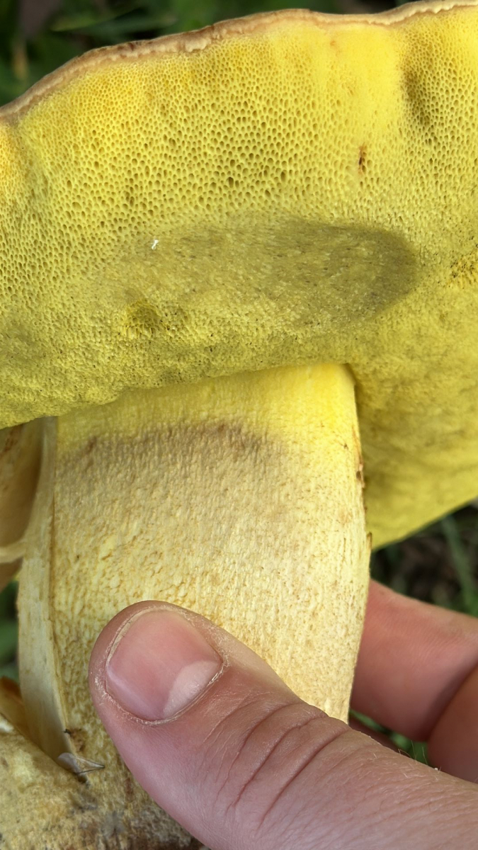 Meine erste Idee war B. appendiculatus, allerdings will das nicht so 100% passen. Vor allem ist das Trama eher weiß und nur zu den Röhren hin und am inneren Rand des Stiels gelb. Am Stiel ist offensichtlich kein Netz. Auch ist kein Blauen zu erkennen.