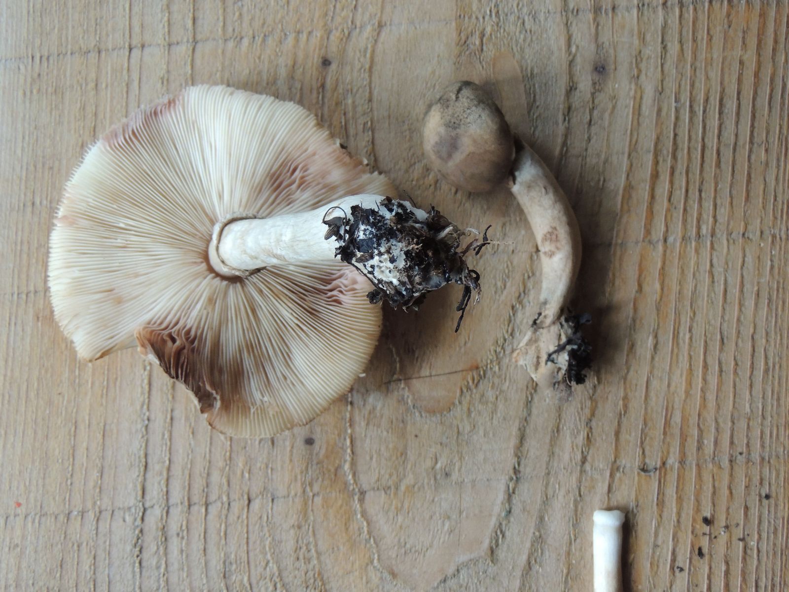 Welchen Pilz habe ich hier. Hutgrösse vom geernteten Pilz ist 8 cm. Hutfarbe weissbräunlich. Lamellen ebenfalls weissbräunlich. Er duftet nach Pilz keine Verfärung bei Druckstellen. Der Stiel hat einen nicht verschiebbaren Ring. Der Stiel ist faserig und innen hohl. Er wächst in meinem Blumentopf beim Rosmarin.