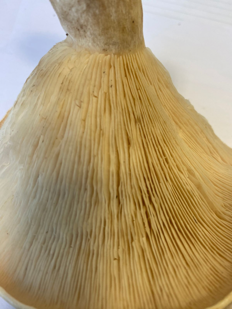 Die Lamellen sind cremeweiß bis leicht gelblich, sehr eng und nicht brüchig, am Stiel herablaufend, z.T. Zwischenlamellen. NICHT LEICHT ABLÖSBAR (zumindest nicht mit den Fingern greifbar, kann man da was verkehrt machen?)