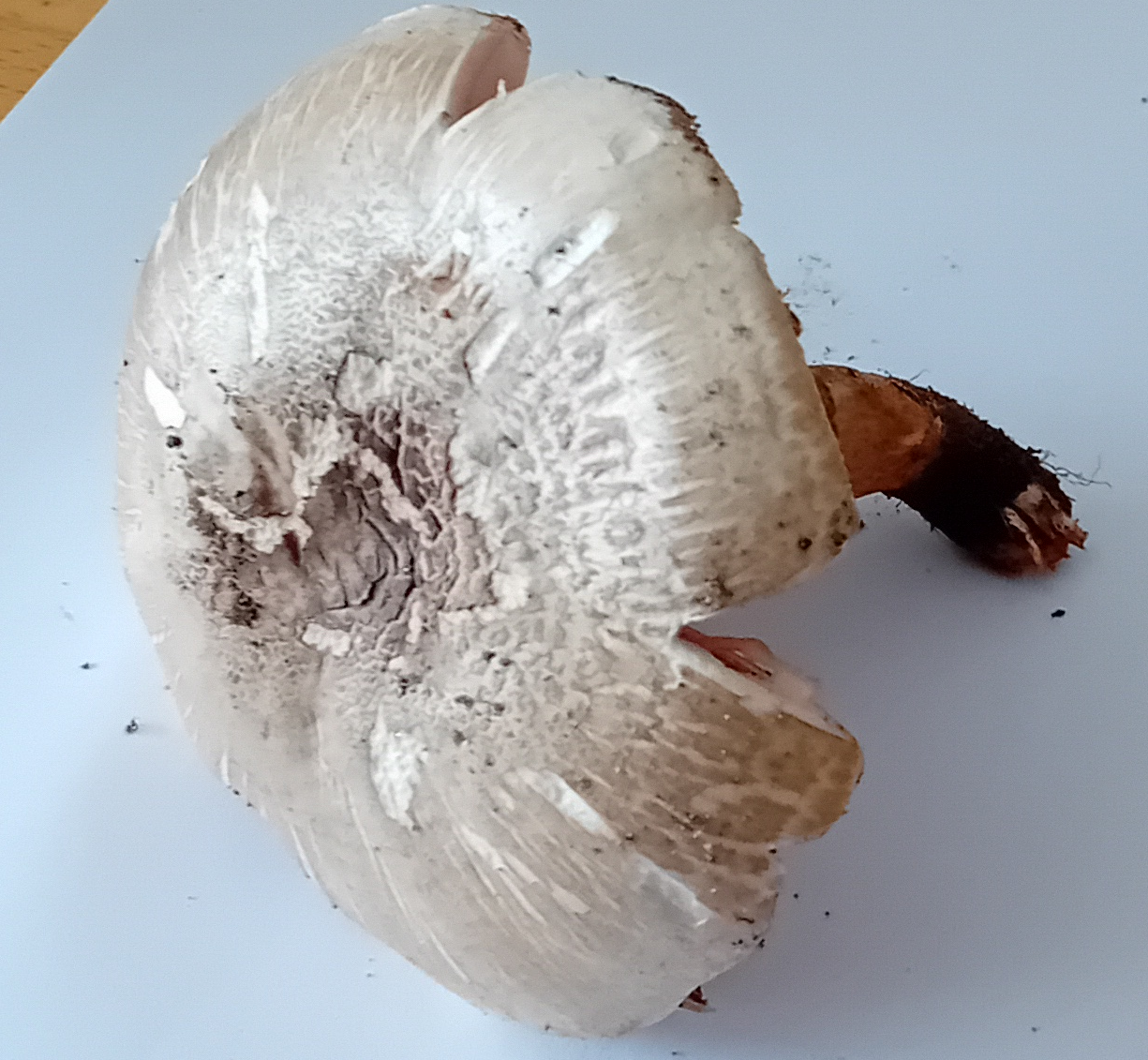 Aufgrund der freistehenden rosa Lamellen hätte ich es auf den ersten Blick für einen Champignon gehalten, auch die 123pilzsuche findet vor allem Champignons. Was mich irritiert ist der stark gerissene Hut und der fehlende Ring. Nun ist der Ring zwar manchmal schnell vergänglich, aber bei diesem Pilz war der Hut gestern noch geschlossen.