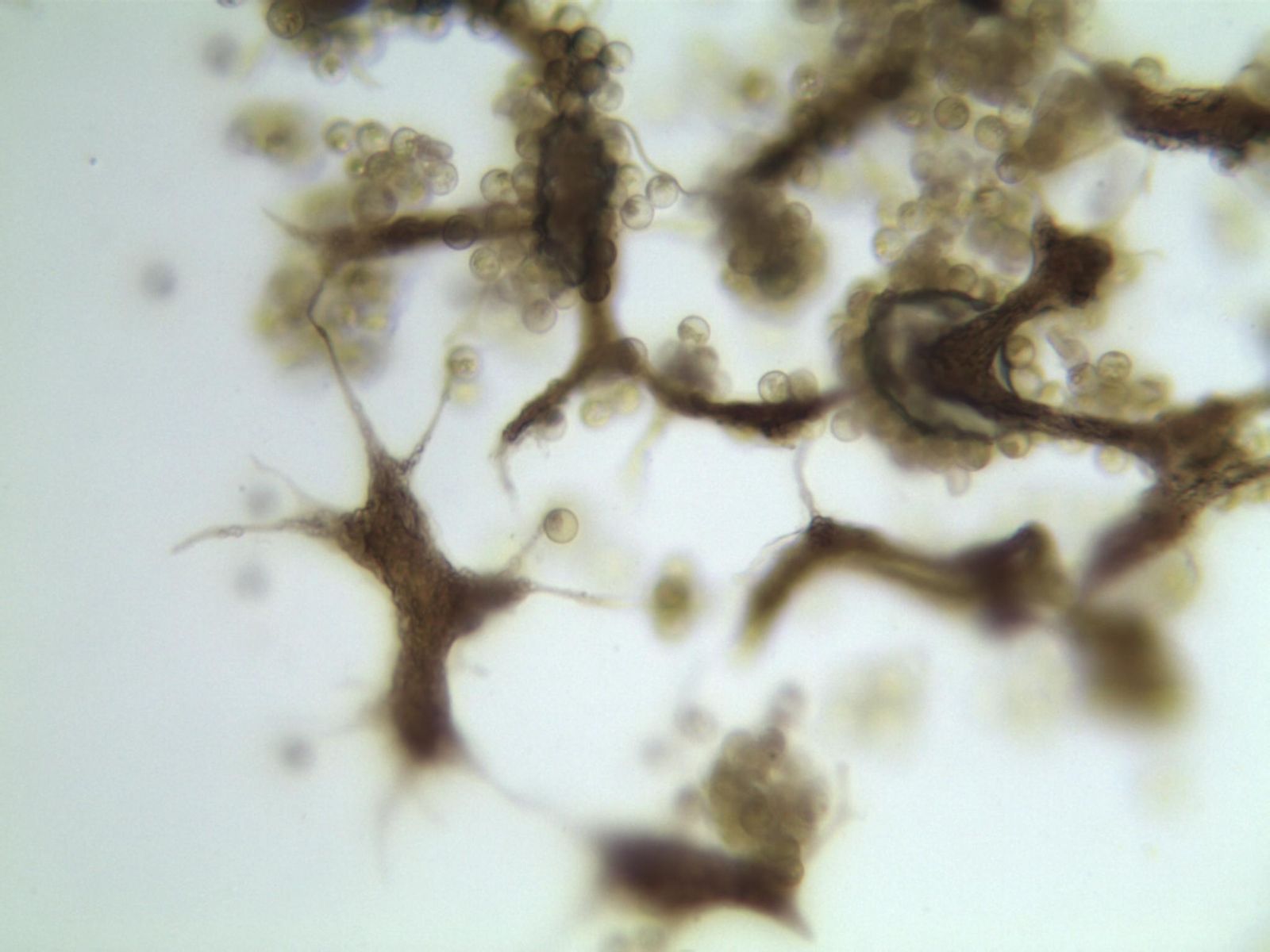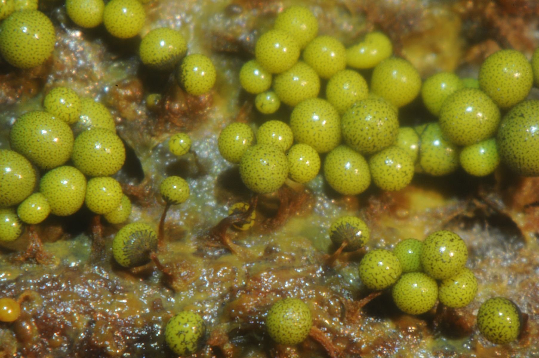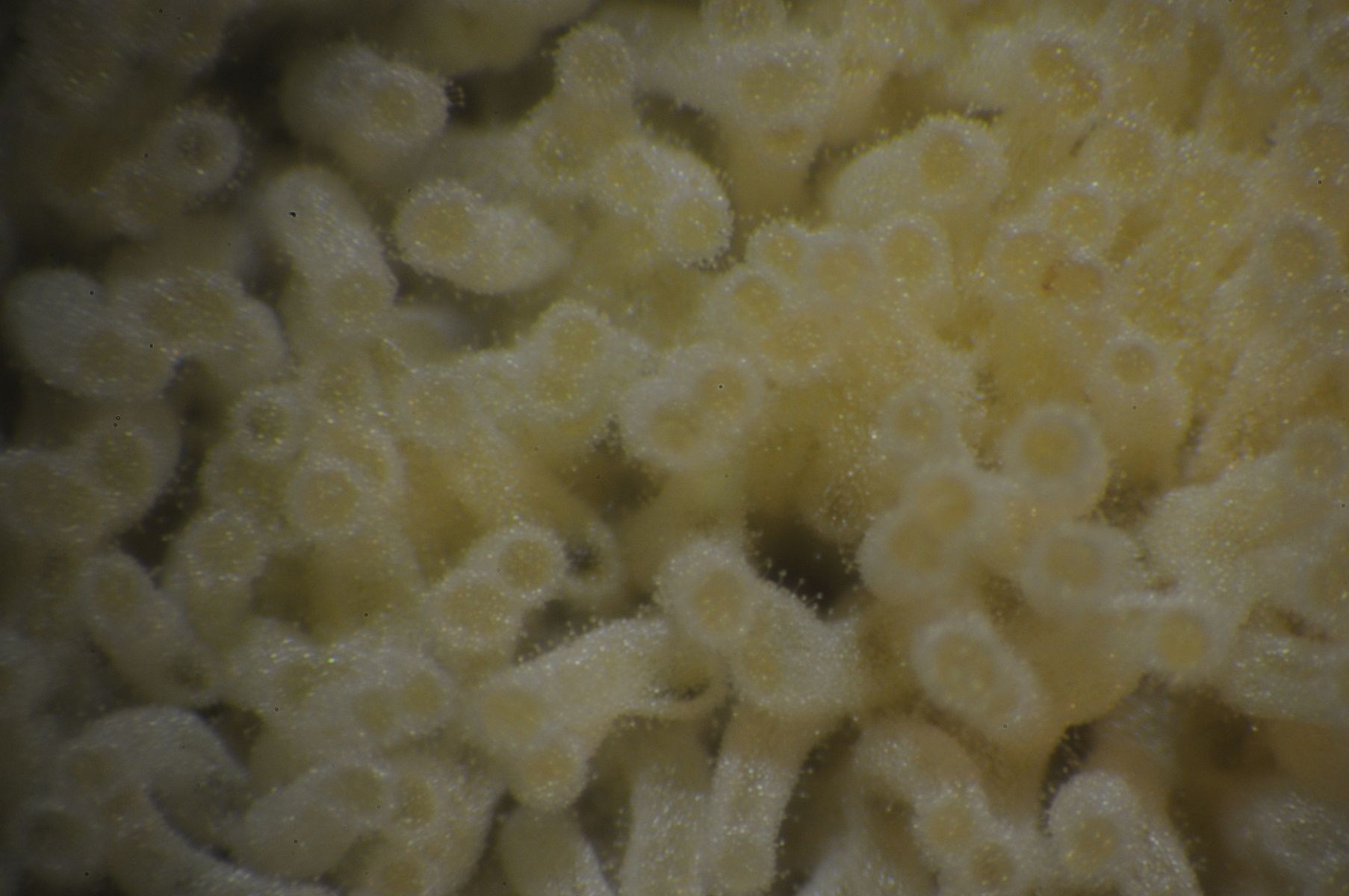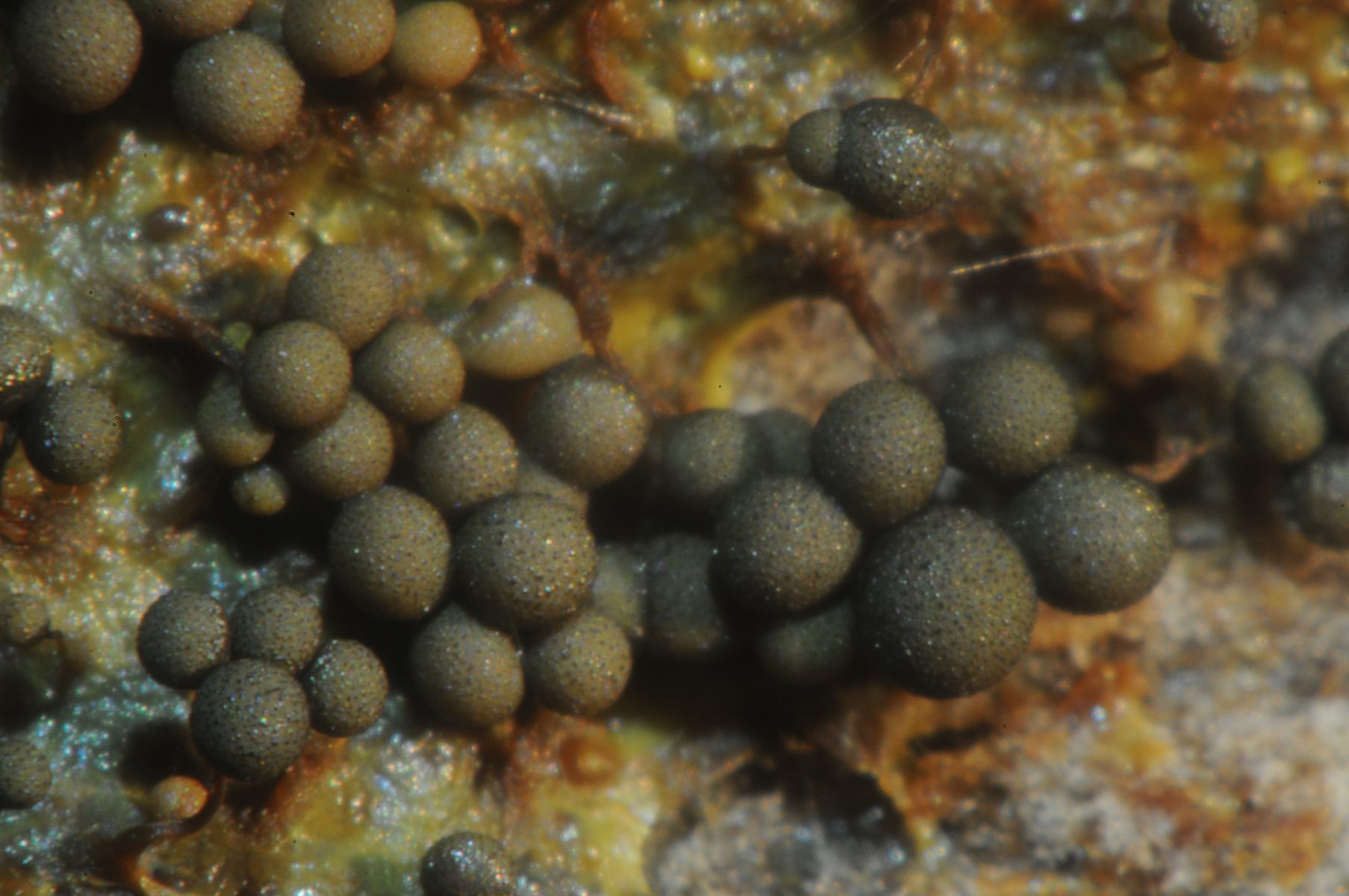 ich würde auch Ceratiomyxa fruticulosa var. poroides raten, aber Schleimer sollten reif sein, bevor man sie bestimmen kann. Die Sporenmasse und der granulierte Inhalt stehen aber auch passend in meinem Buch ![]()