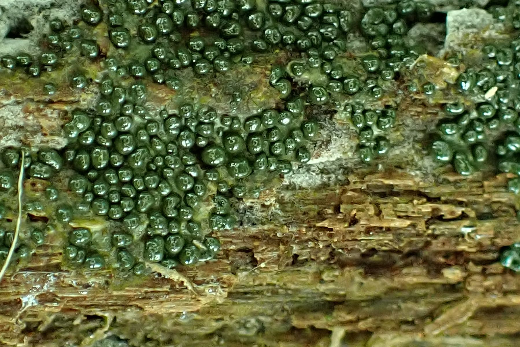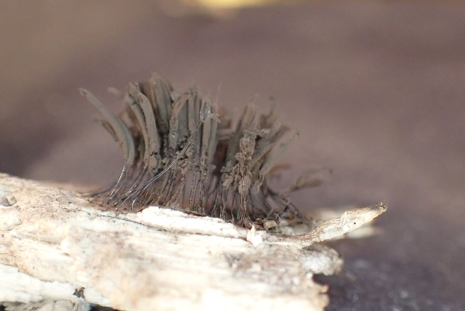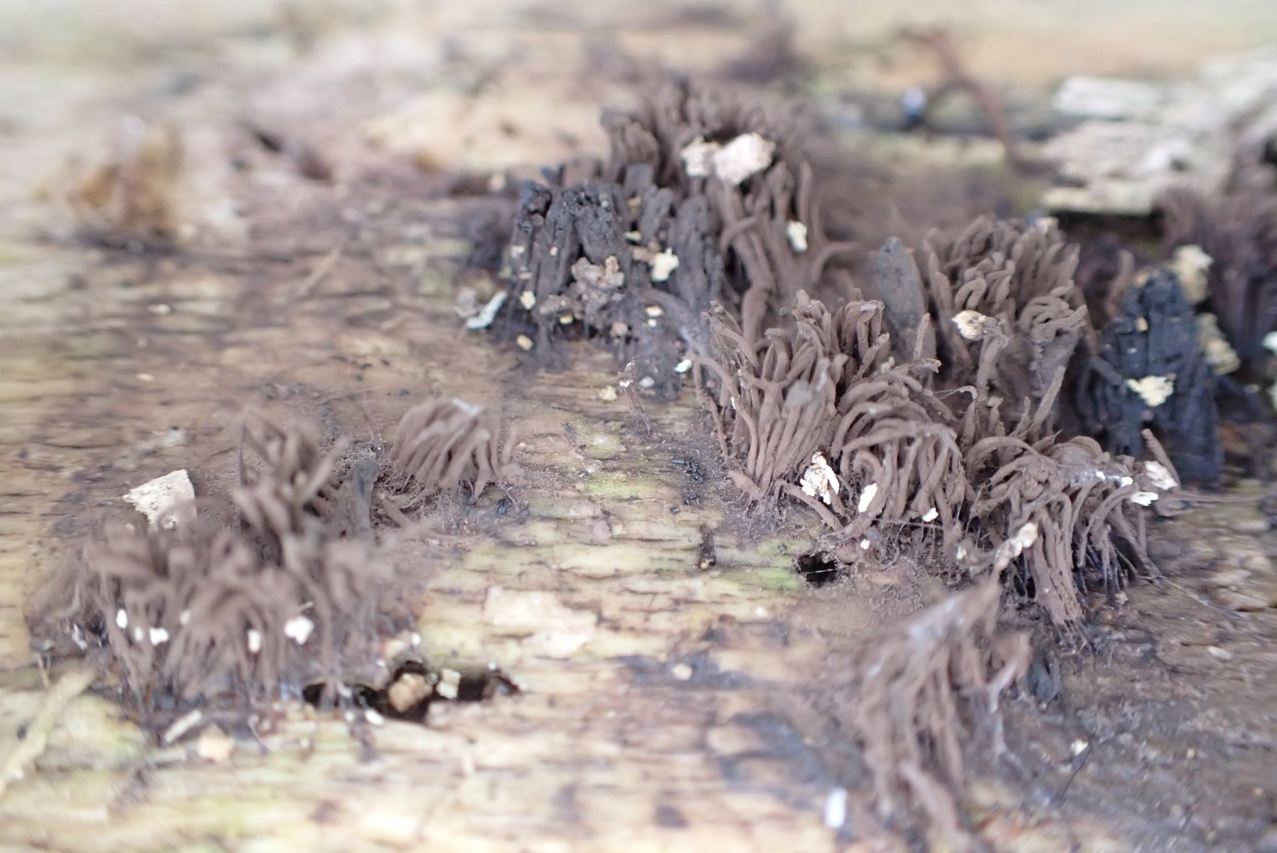 Aber leider lassen sich diese Viecher- falls überhaupt - nicht makroskopisch bestimmen. Mit dem sichtbaren Stielchen der Einzelfruchtkörper geht das in Richtung Stemonitis - Stemonaria - Stemonitopsis. Solange sie so "verklebt" sind wie auf dem letzten Fotos erkennbar, sind sie auch noch nicht ganz reif. Die Farbe ändert sich evtl. auch noch.