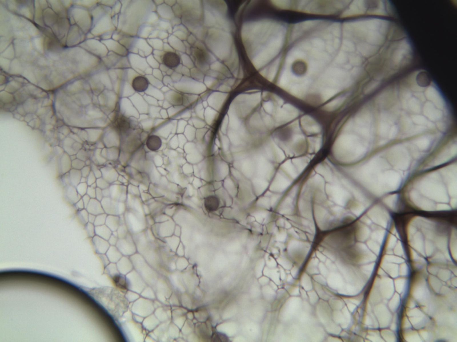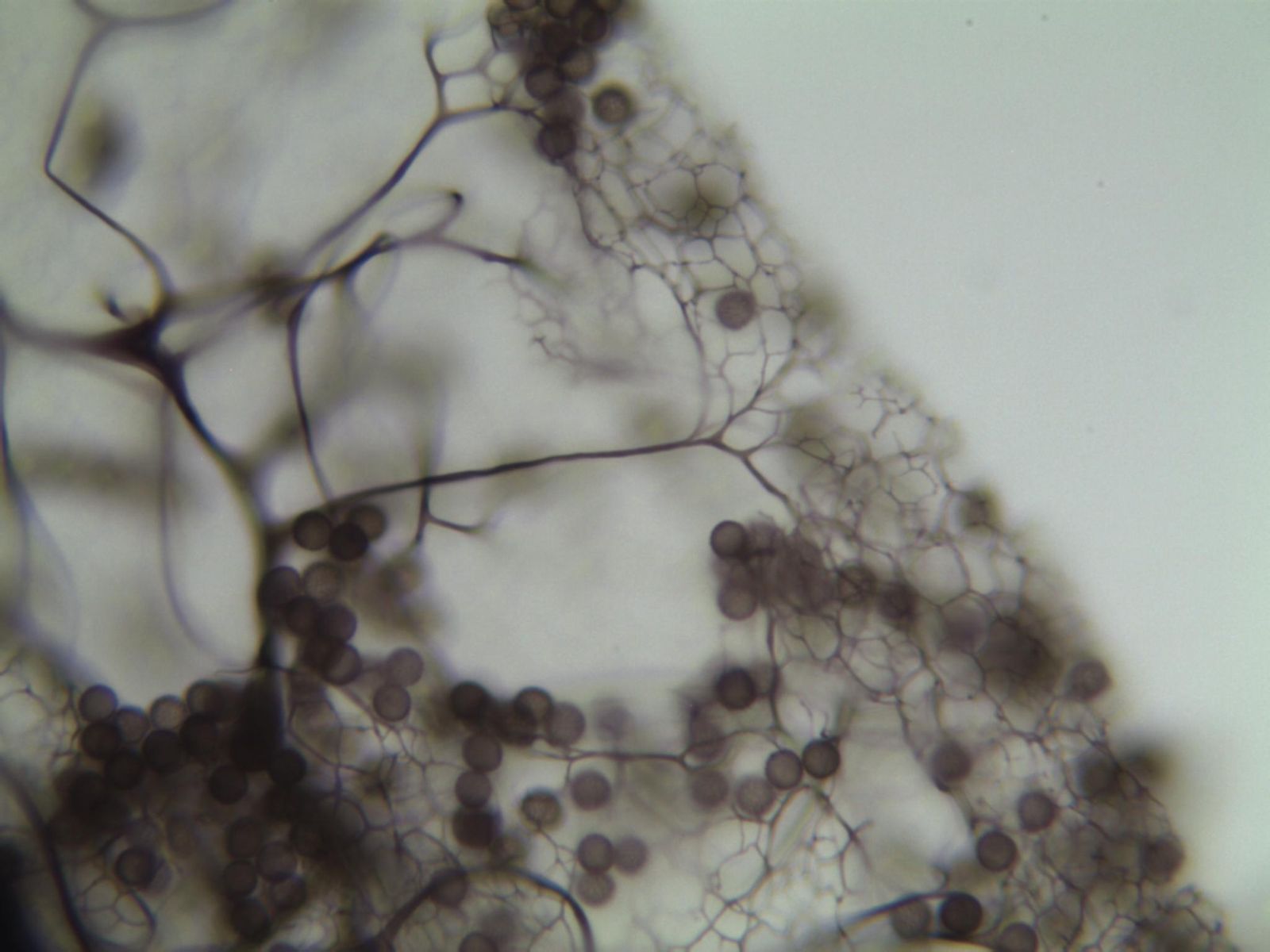 Ich habe immer Schwierigkeiten mit der Maschenweite, da ich da selten sehe welche da zu welcher gehört und irgendwie alle andere Durchmesser haben. Das Oberflächennetz beginnt an der Columnella und da die Sporen sehr deutlich warzig sind, habe ich mich für Stemonitis splendens entschieden.