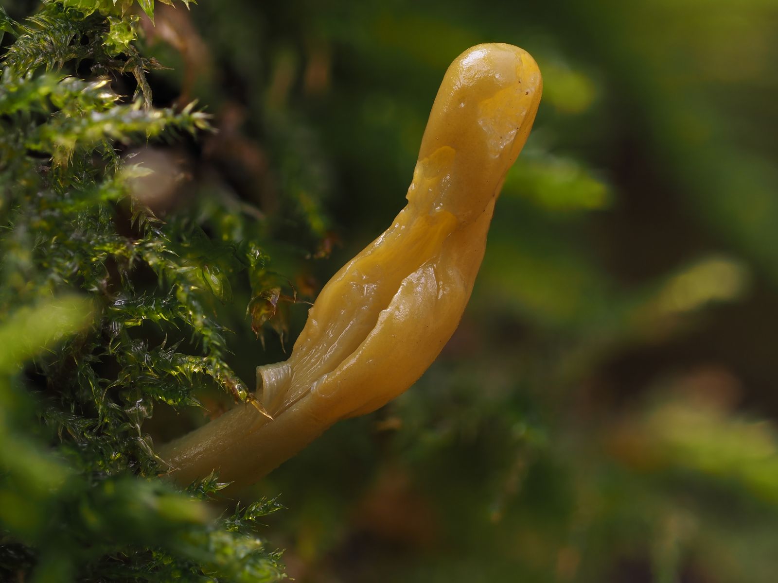 Mir bis dahin auch noch nicht untergekommen waren neben normalen Klebrigen Hörnlingen (Calocera viscosa) auch eine Albinoform. Falls jemand bessere Vorschläge dafür hat, immer her damit! Mikroskopisch konnte ich aber bis auf das fehlende Pikment keine Unterschiede feststellen: