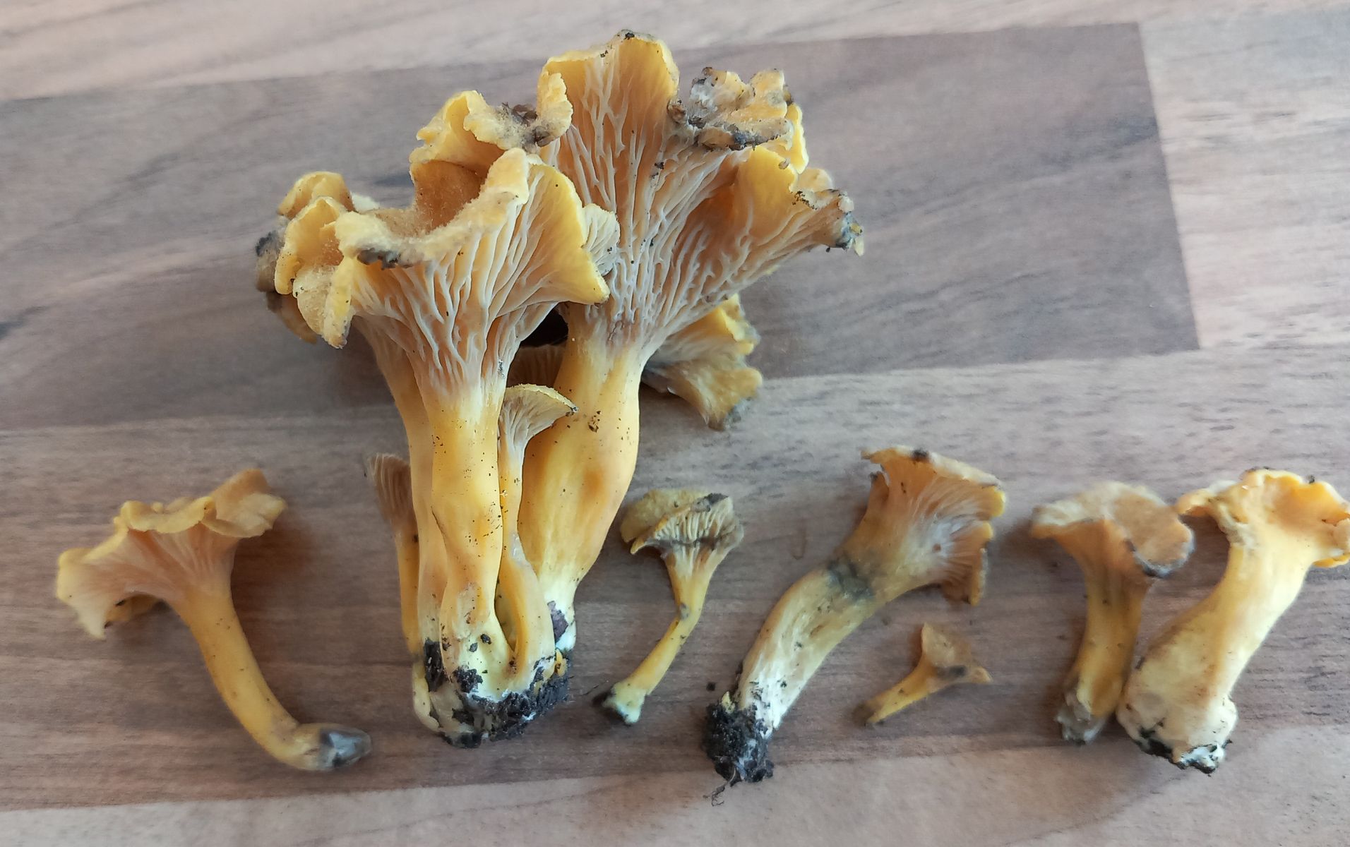 Gestern brachte mir die ältere Tochter eine Hand voll vermeintlicher etwas gelb geratener Trompetenpfifferlinge, die ich aber eher als schwärzende Kraterelle (das wäre ein sensationeller Erstfund) sehe. Was meint ihr?