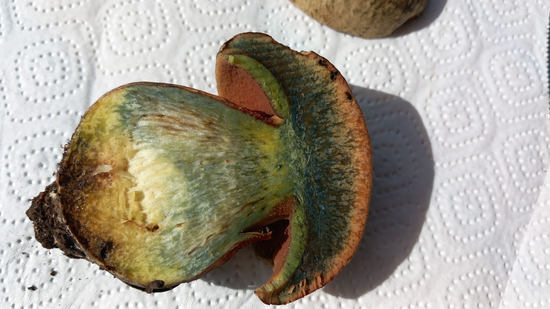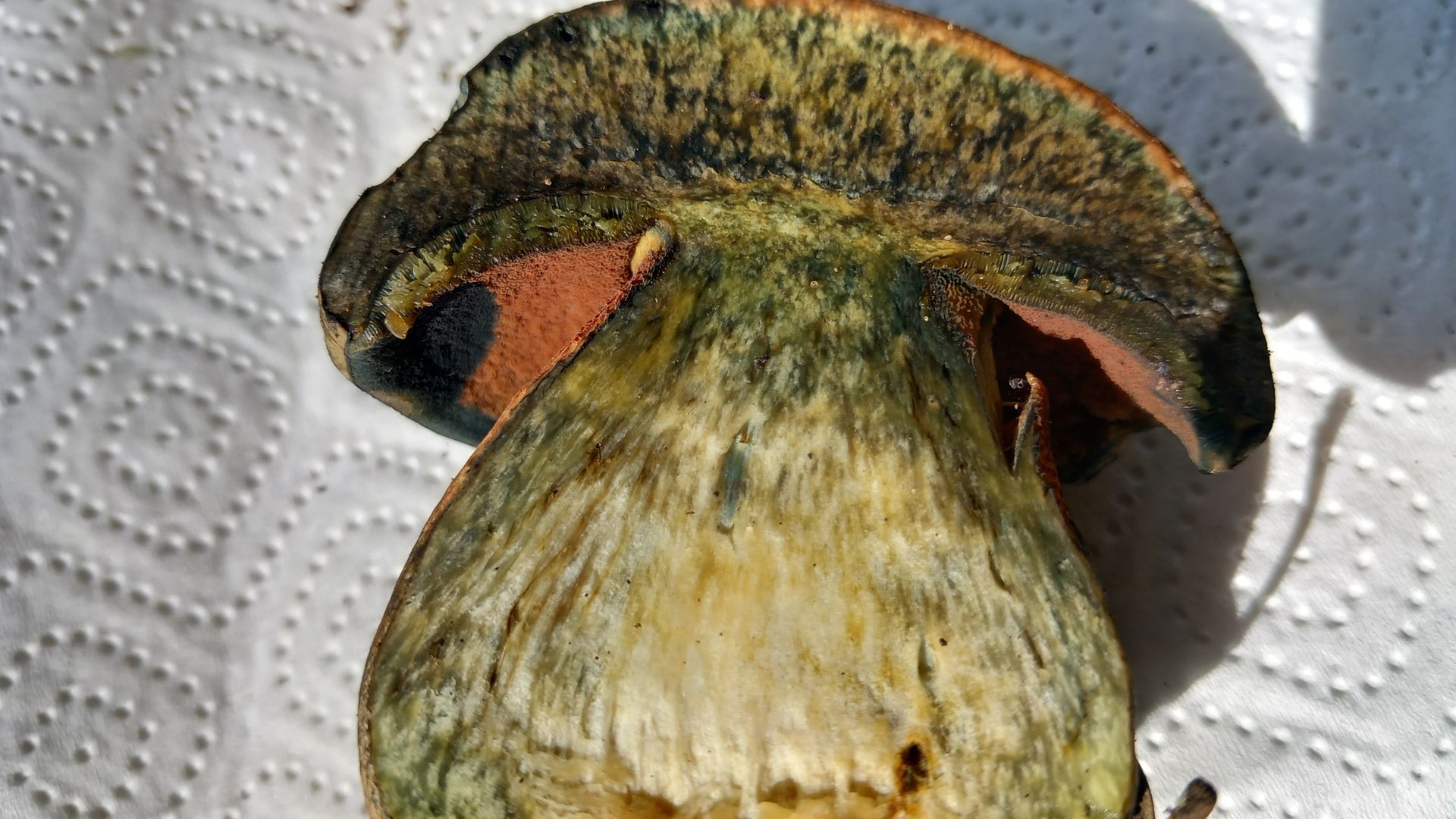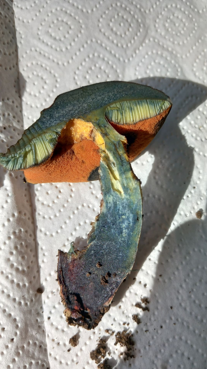 Stiel mit deutlichem roten Netz auf gelbem Grund. Stiel und die braunroten Röhren auf Druck blauend. Schnittbild s.u., im Schnitt schwächer blauend als der vermutliche queletii. Direkt unter der Huthaut dabei eine Zone ohne Blauen. Bataille-Linie sehe ich nicht.