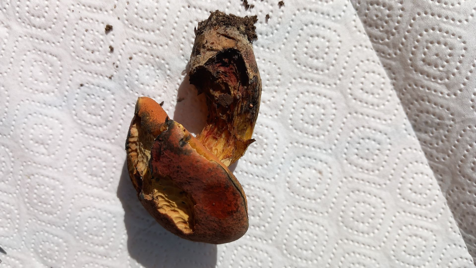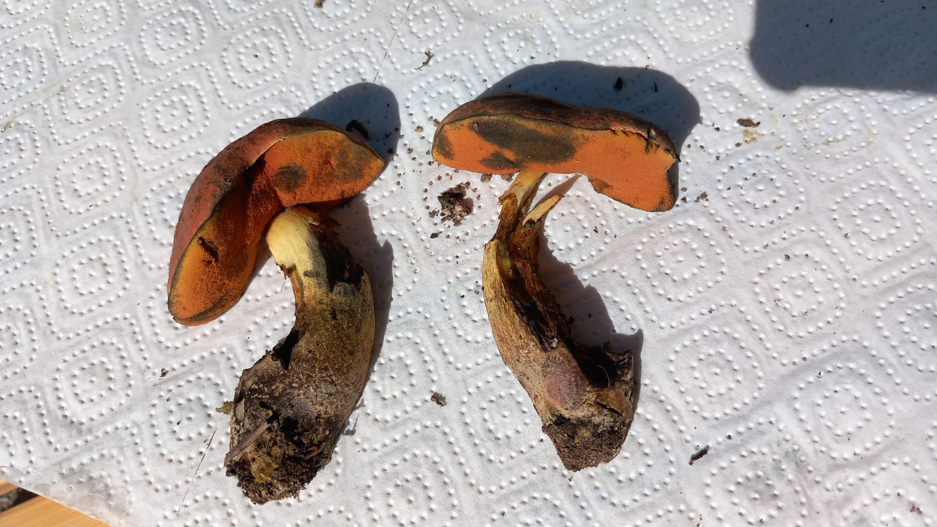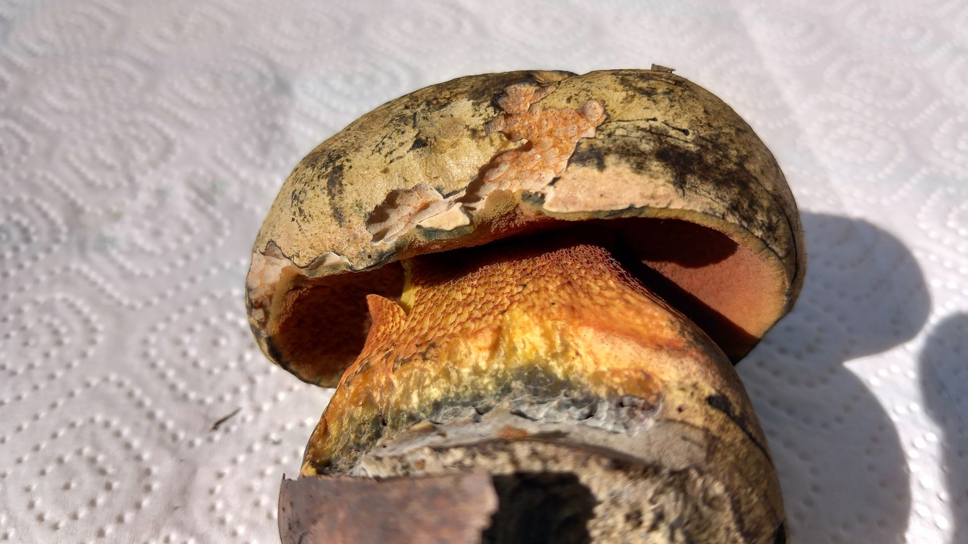 Stiel mit deutlichem roten Netz auf gelbem Grund. Stiel und die braunroten Röhren auf Druck blauend. Schnittbild s.u., im Schnitt schwächer blauend als der vermutliche queletii. Direkt unter der Huthaut dabei eine Zone ohne Blauen. Bataille-Linie sehe ich nicht.