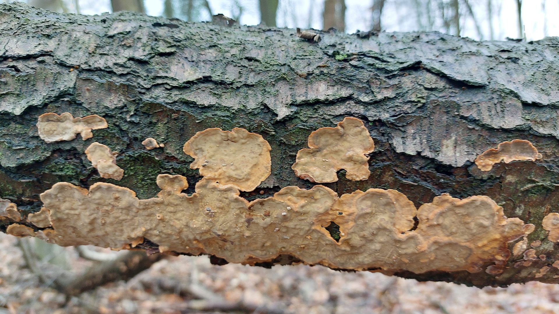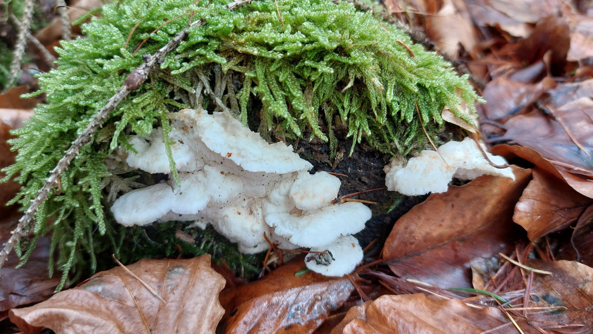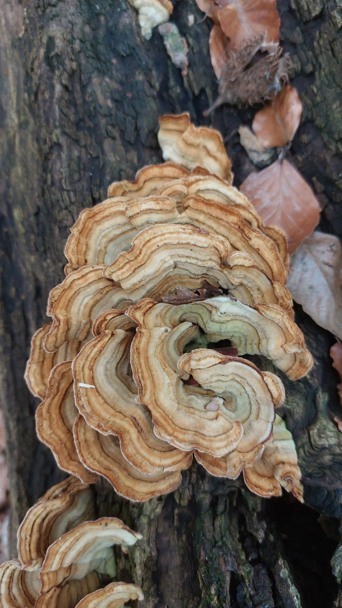 1. Hier bin ich bei meinen Bestimmungsversuchen bei der Ockertramete (Trametes ochracea)) gelandet. Kann das stimmen? Eichen und Buchen waren in der Nähe gestanden, das Substrat würde ich für Eiche halten, bin mir aber nicht sicher. Die Größe der Fruchtkörper sollte aus dem Vergleich mit dem Buchenlaub ersichtlich sein. Das dritte Foto zeigt die Unterseite mit creme- bis ockerfarbenen Poren. Bei einer Schmetterlingstramete sollten wohl mehr dunkle Farbtöne dabei sein. Oder liege ich schon mit der Tramete falsch?