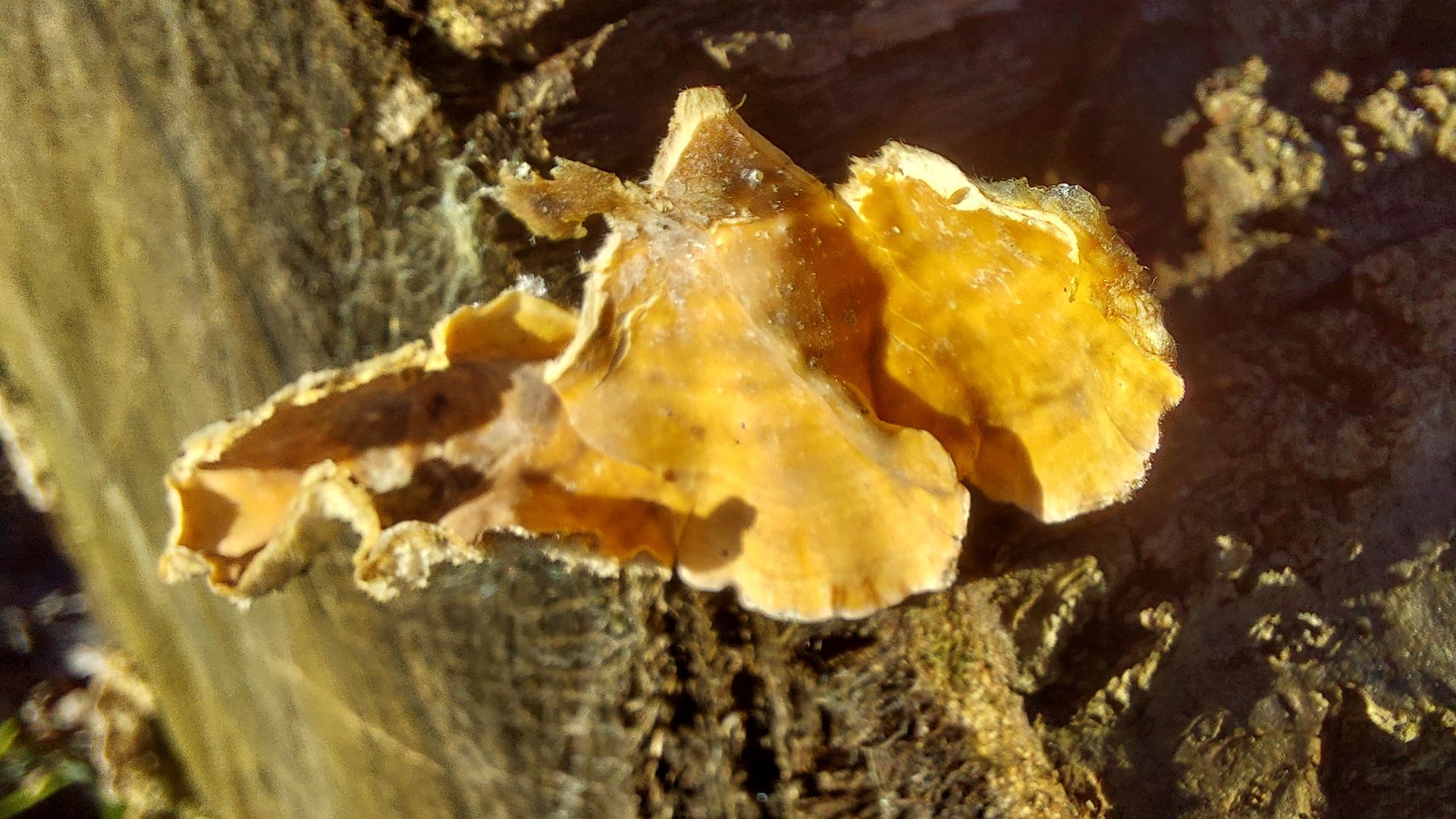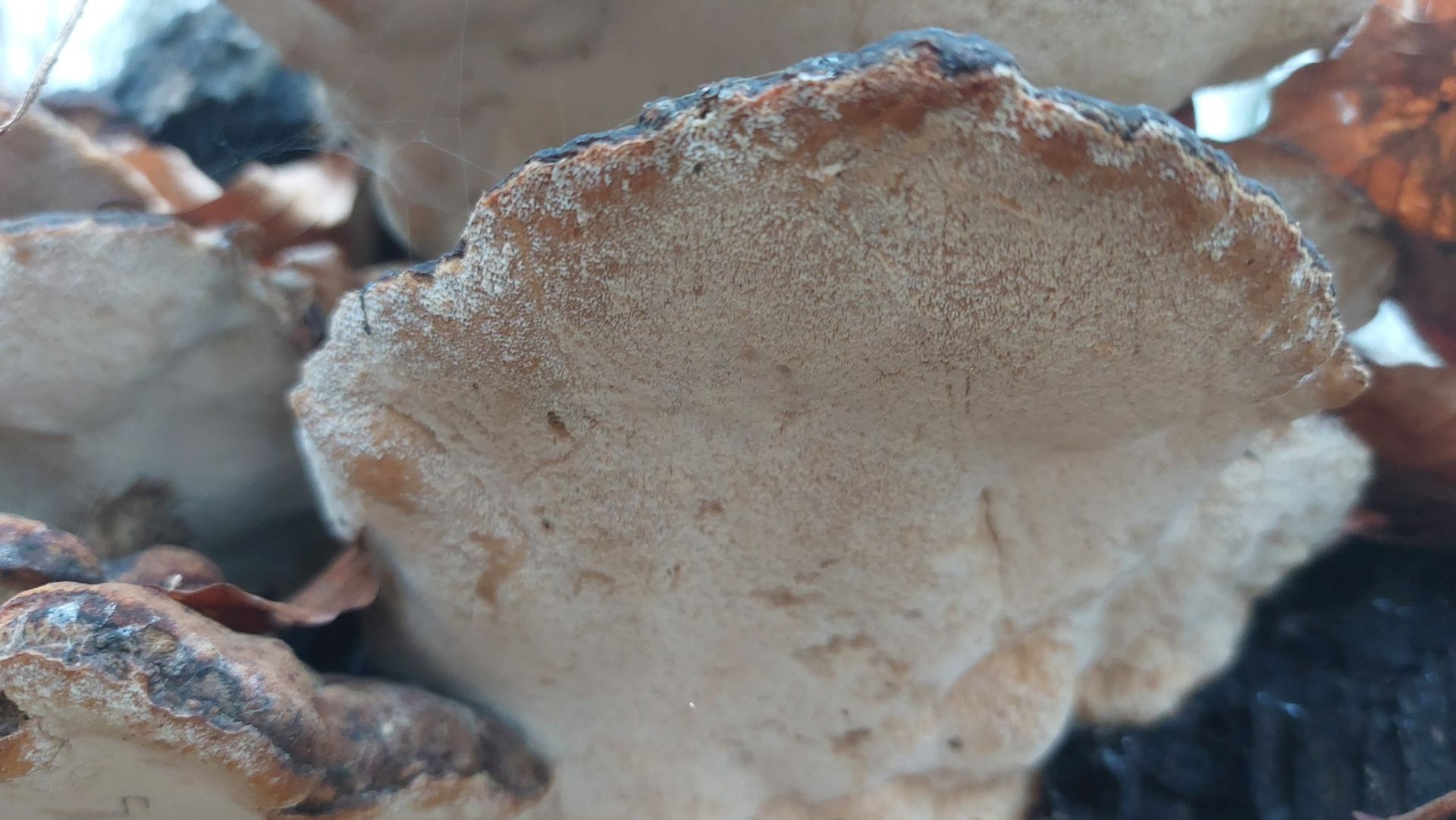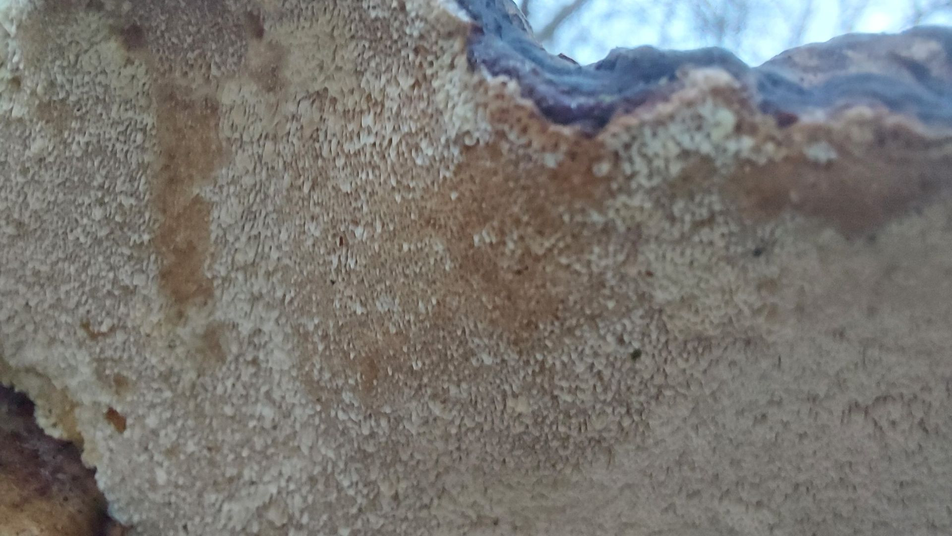 1. Hier bin ich bei meinen Bestimmungsversuchen bei der Ockertramete (Trametes ochracea)) gelandet. Kann das stimmen? Eichen und Buchen waren in der Nähe gestanden, das Substrat würde ich für Eiche halten, bin mir aber nicht sicher. Die Größe der Fruchtkörper sollte aus dem Vergleich mit dem Buchenlaub ersichtlich sein. Das dritte Foto zeigt die Unterseite mit creme- bis ockerfarbenen Poren. Bei einer Schmetterlingstramete sollten wohl mehr dunkle Farbtöne dabei sein. Oder liege ich schon mit der Tramete falsch?