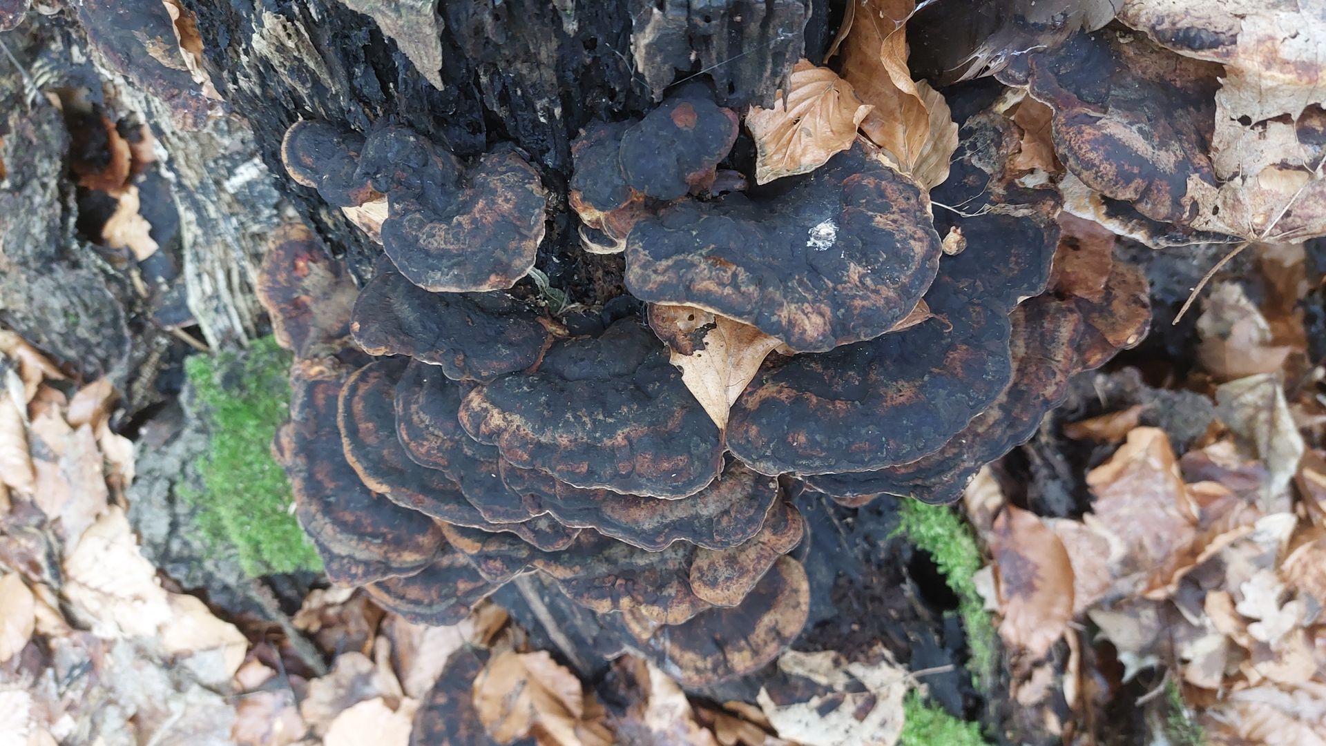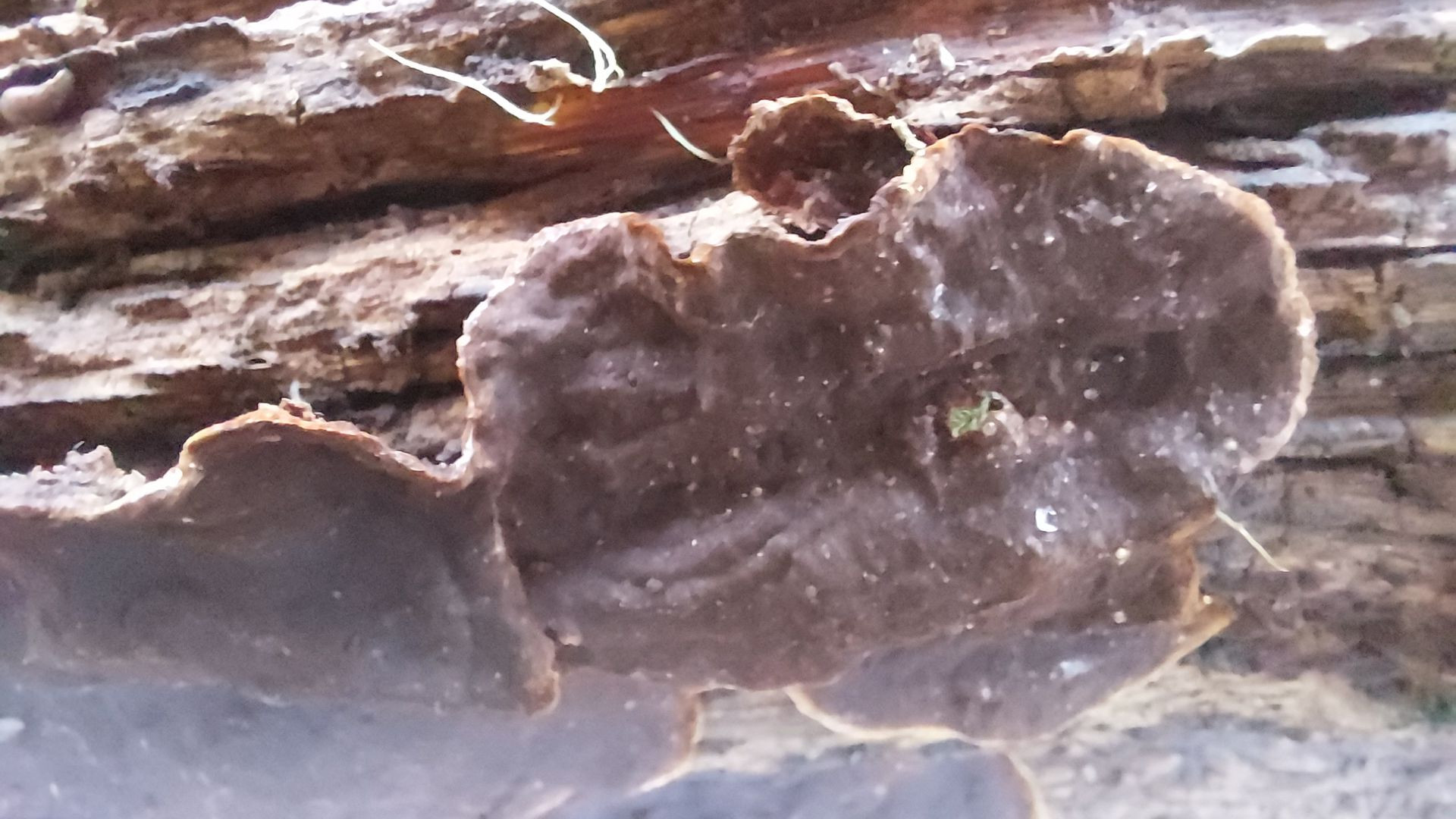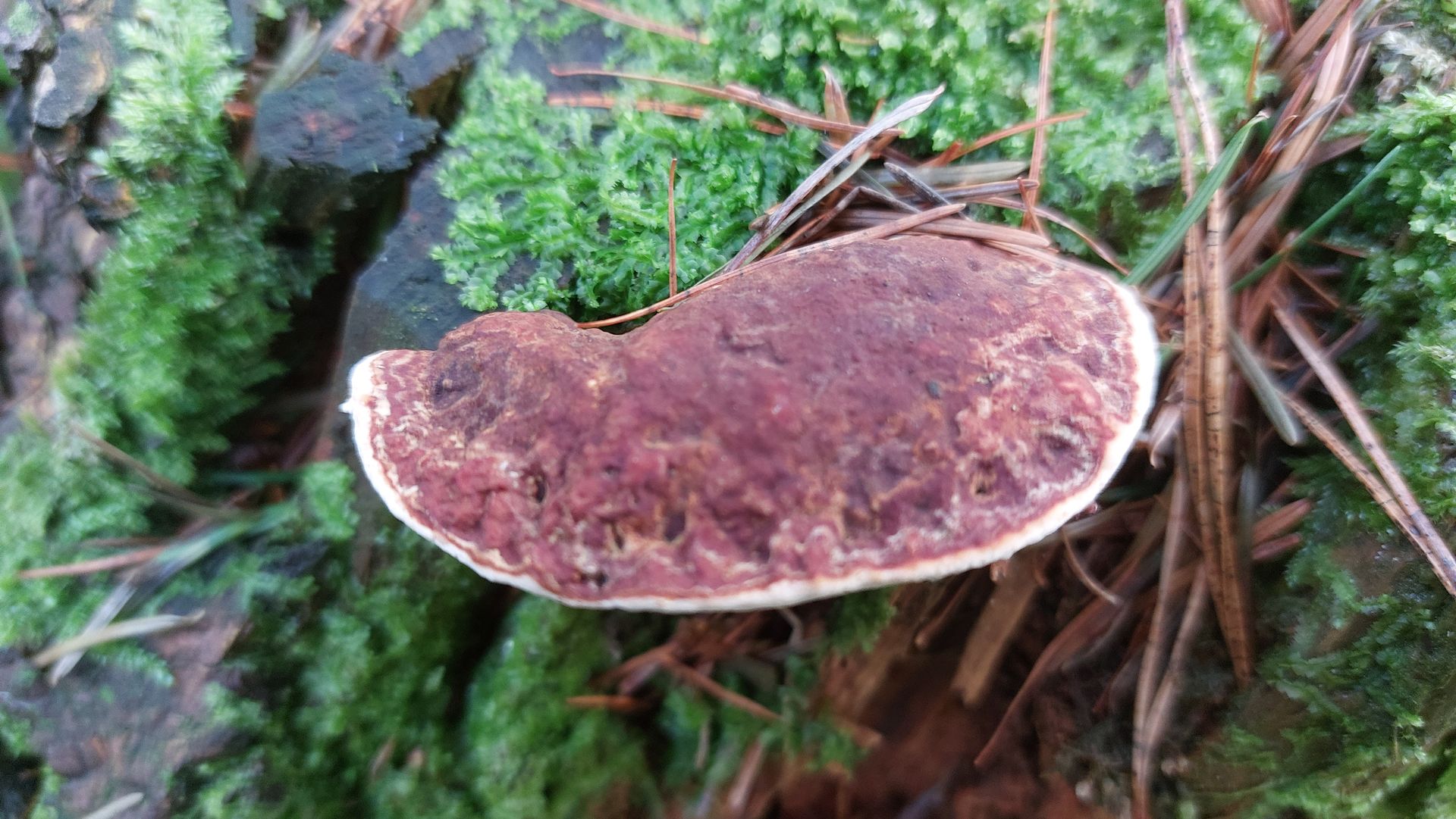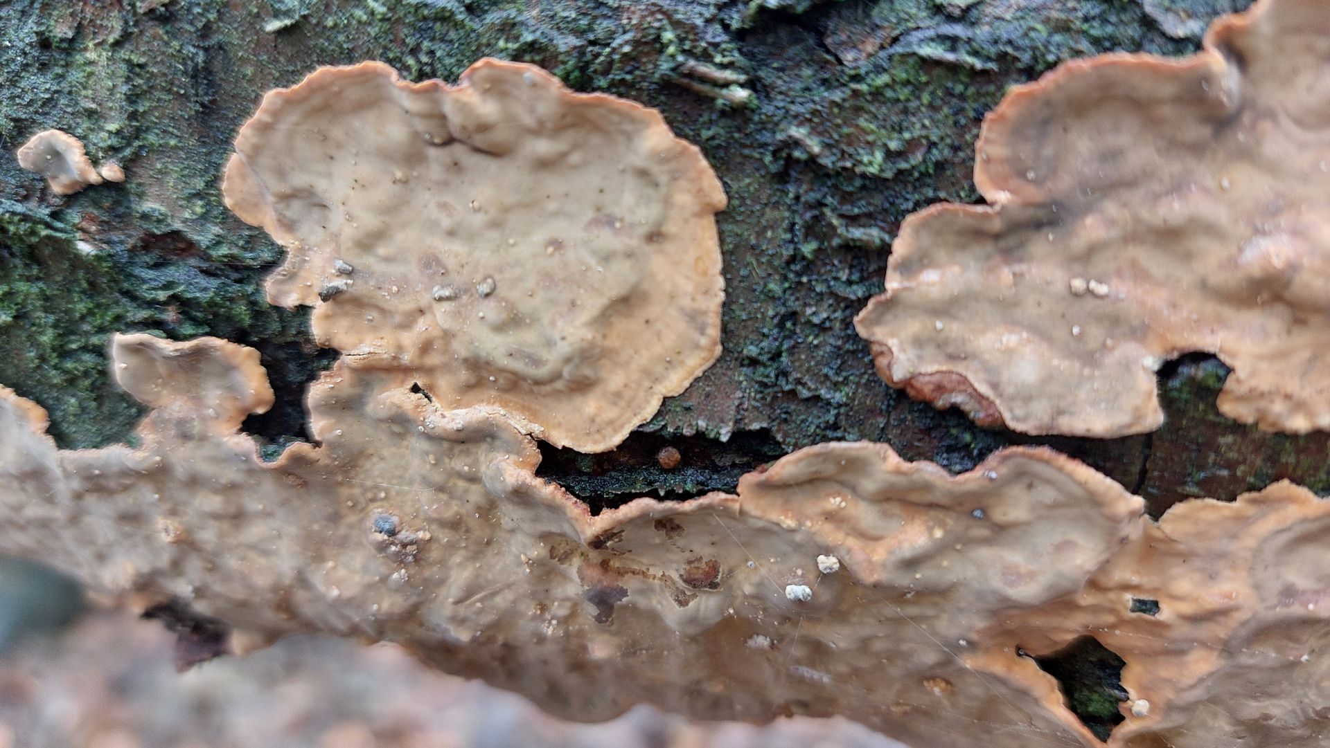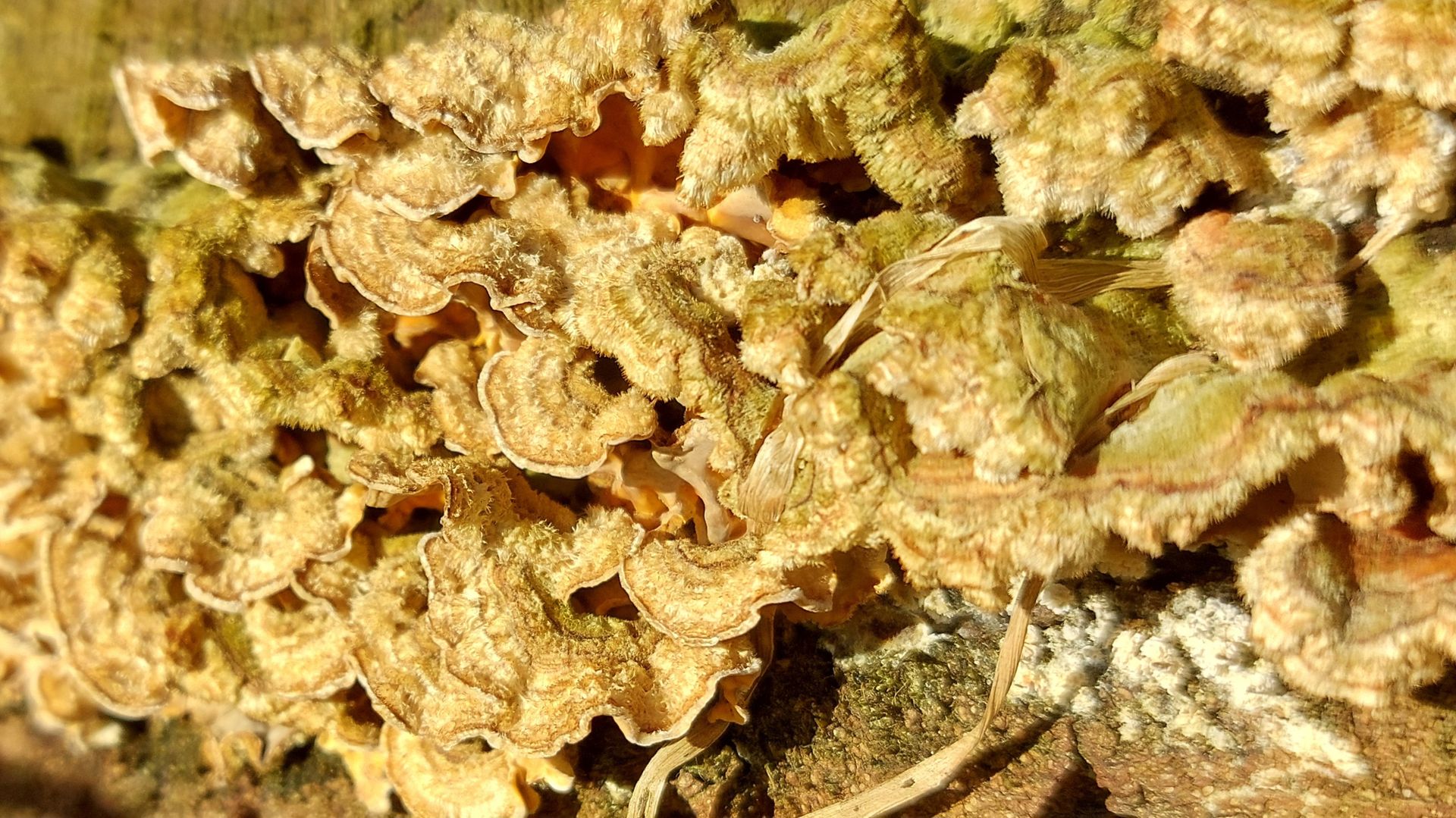 (2) Gleiches Habitat wie (i), auf einem stark verrotteten Stück Holz. Bei meinen Bestimmungsversuchen bin ich bei einer Borstenscheibe gelandeten. Lässt sich da Genaueres sagen oder zumindest spekulieren? Die einzelnen Scheiben sind so ca. 6cm im Durchmesser.