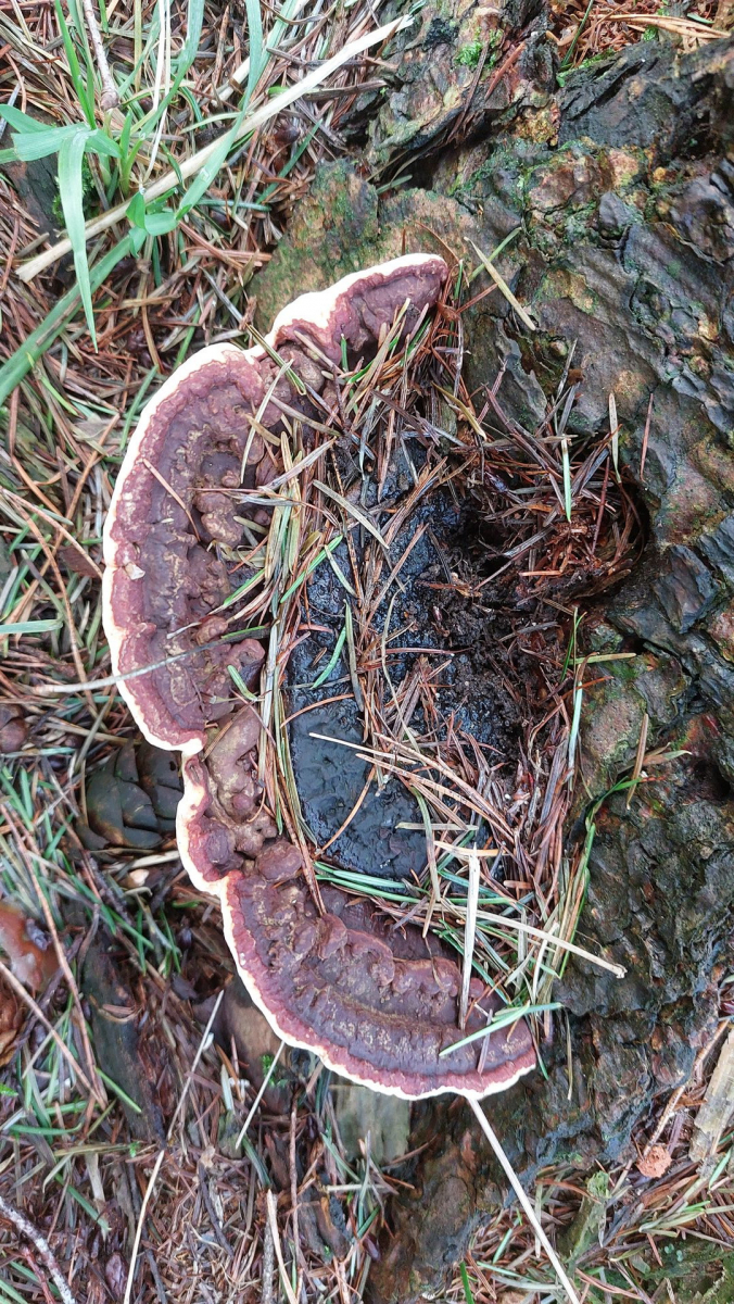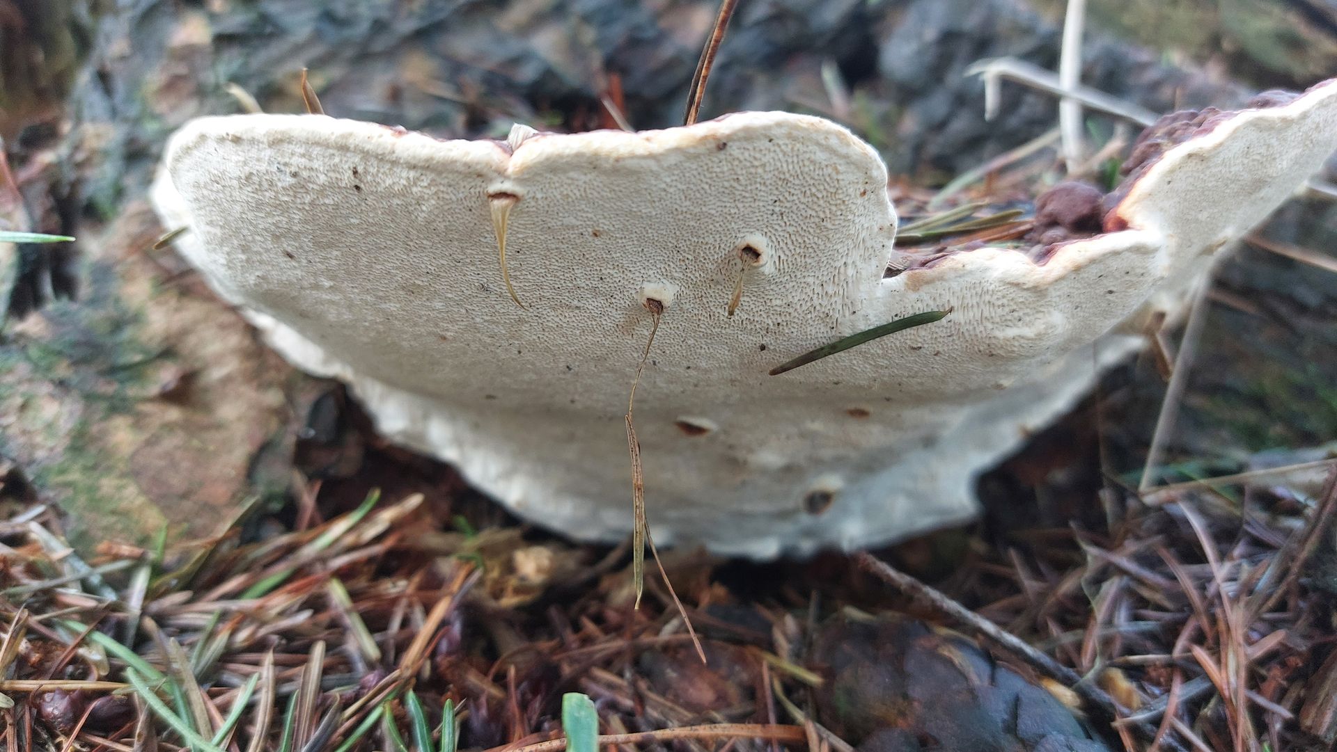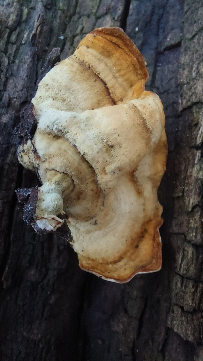 (9) Und hier noch ein Fund, bei dem mir schon die grobe Eingrenzung schwerfällt. Wächst an einem Baumstamm, der Kiefer sein könnte, es standen aber auch Eichen in der Gegend. Die ersten beiden Bilder sind von einem älteren Fruchtkörper, Bild 3 und 4 von einem jüngeren am selben Stamm. Das ältere Exemplar hat so eine dunkle, lackartige Fläche an der Anwachsstelle, deshalb habe ich ein bisschen bei den Lackporlingen gesucht. Oder kann es sich um einen Wurzelschwamm handeln, der so was anscheinend auch zeigen kann? Auf der Unterseite (Bild 2) sind außerdem ein paar auffällige "Pickel".