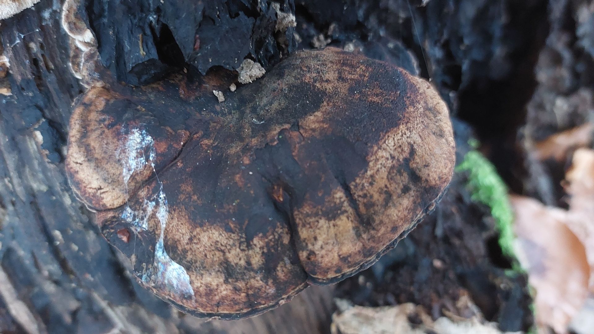 2. Vielleicht ein Laubholzharzporling (Ischnoderma resinosum)? Guttationstropfen waren keine zu sehen, der Geruch war auffallend pilzig bis süßlich. Substrat sollte ein Eichenstumpf sein, Buchen gab's ansonsten auch noch.