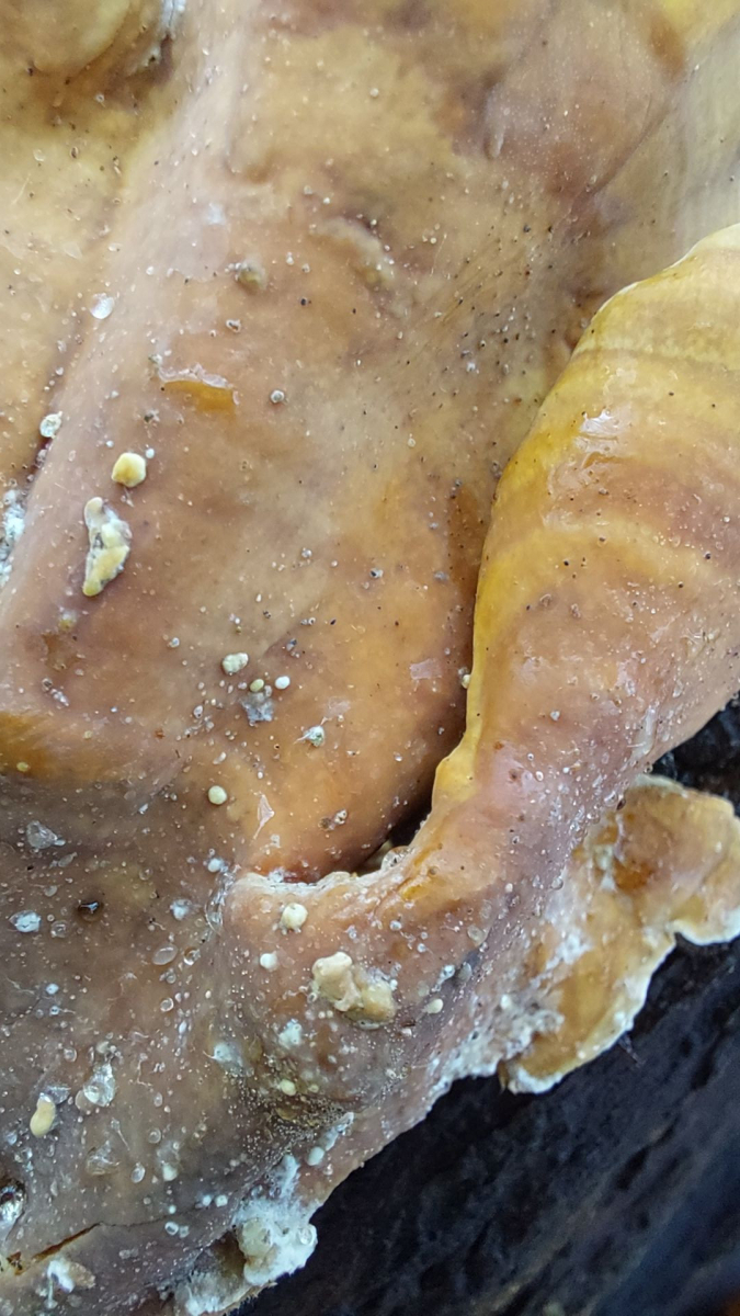 Zu 2.), also der Frage Ischnoderma benzoinum oder resinosum: Ich habe den verlinkten Beitrag durchgelesen und auch ein Schnittbild angefertigt, aber das ganze ist mir doch reichlich unklar geblieben. Das Fleisch ist braun, aber auch nicht so sehr dunkelbraun, und ob der von mir fotografierte Fruchtkörper ausreichend alt war, ist mir auch unklar. Hart war er sicher nicht, sondern vom vielen Regen in letzter Zeit durchweicht und vollgesogen wie ein Schwamm. Ich denke, ich verbuchte den Fund als Ischnoderma sp., vermutlich resinosum (wg. dem Substrat).