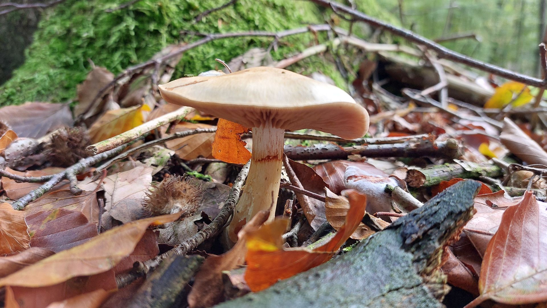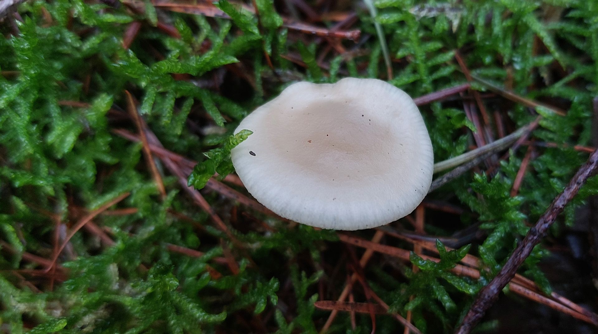 (8) Bei diesem Fund bin ich eigentlich beim Weißen Anistrichterling (Clitocybe fragrans) gelandet. Ein Anis- oder Fenchelgeruch war deutlich wahrnehmbar, der Wuchsort (im Moos in einem Laubwald) scheint auch zu passen. Zwei Dinge haben mich allerdings etwas verwirrt: erstens die Jahreszeit (Februar, nicht Herbst), und zweitens die Tatsache, dass der Fruchtkörper sehr stark asymmetrisch ist. Eher noch stärker, als man im Bild sehen kann, der Stiel setzt wirklich ziemlich weit entfernt vom Zentrum des Hutes an. Sprechen diese beiden Punkte eher für eine andere Art, oder passt C. fragrans trotzdem?