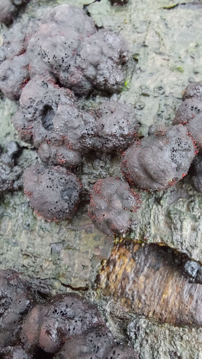 (7) Substrat sollte Buche sein. Beim diesem Fund habe ich ganz schön herumgerätselt wegen der winzigen roten Kügelchen auf den "Brombeeren", bis ich auf die Möglichkeit "Pilz auf einem Pilz" gestoßen bin. Aufsitzender Pustelpilz (Dialonectria episphaeria) auf Rötlicher Kohlenbeere (Hypoxylon fragiforme) ist hier meine Vermutung?