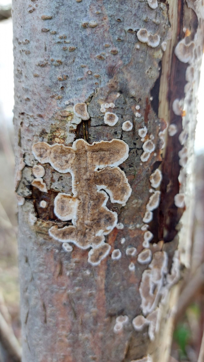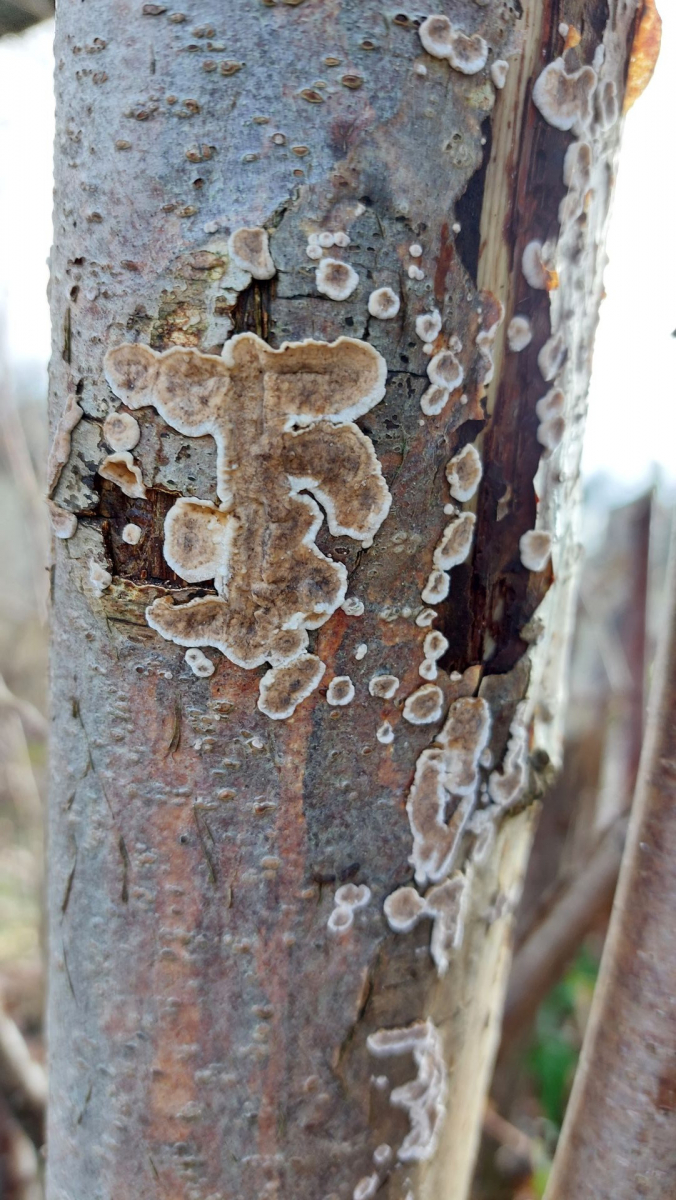 (6) Runzeliger Schichtpilz (Stereum rugosum) vielleicht? Bild 1 & 2 sind von einem Fundort, Bild 3 & 4 von einem anderen, ich könnte mir vorstellen, dass es sich um die gleiche Art handelt, bin aber unsicher.