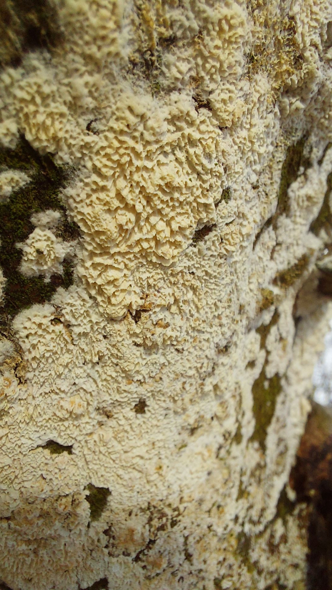 (5) Ein gelblich-weißer, schuppiger Belag auf einem stehenden, toten Baum im Laubwald. Bei der Recherche bin ich auf den Milchweißen Eggenpilz (Irpex lacteus) gestoßen. Ist vermutlich schwer auf Artebene zu bestimmen, aber könnte ich damit zumindest ungefähr richtig liegen?