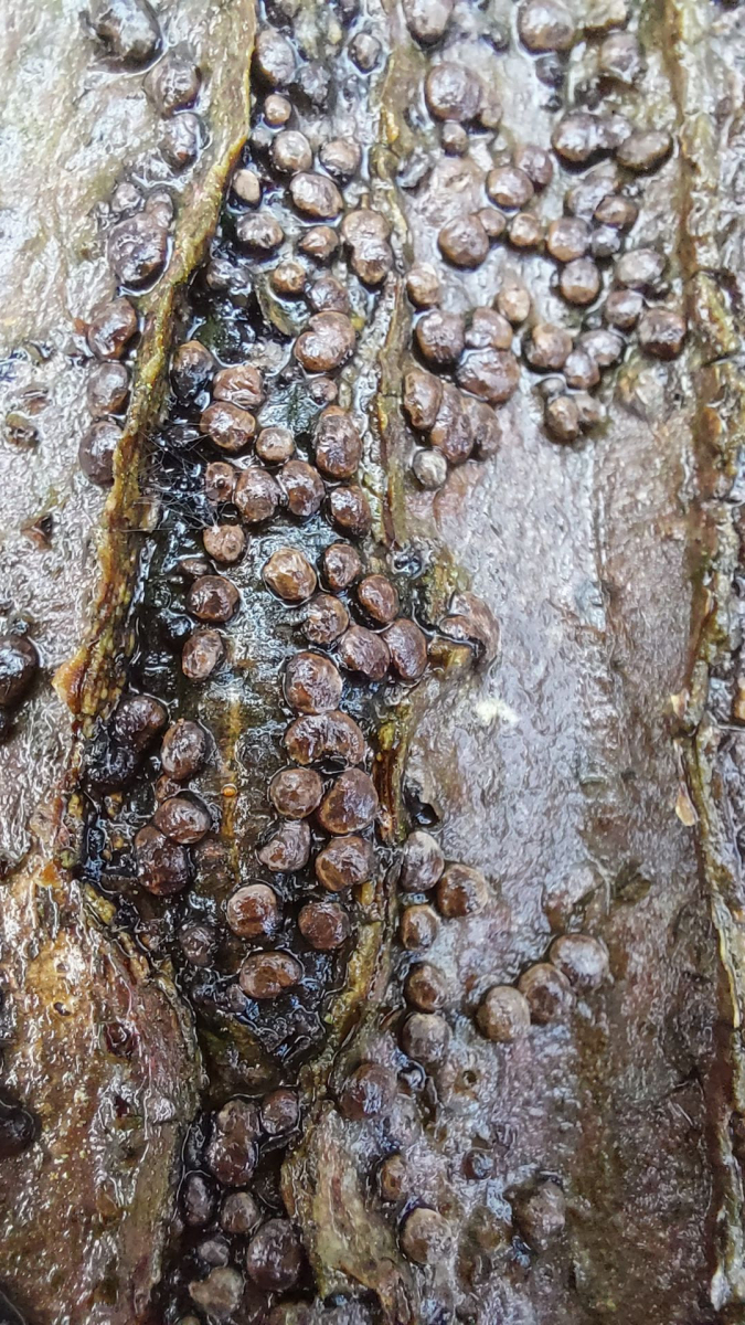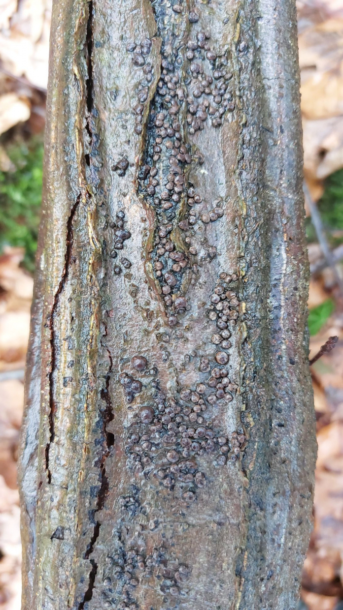 (4) Kleine braune Pusteln auf einem Totholzast. Sind das vertrocknete Blutmilchpilze? Oder irgendetwas kohlenbeerenartiges? Oder noch etwas anderes?