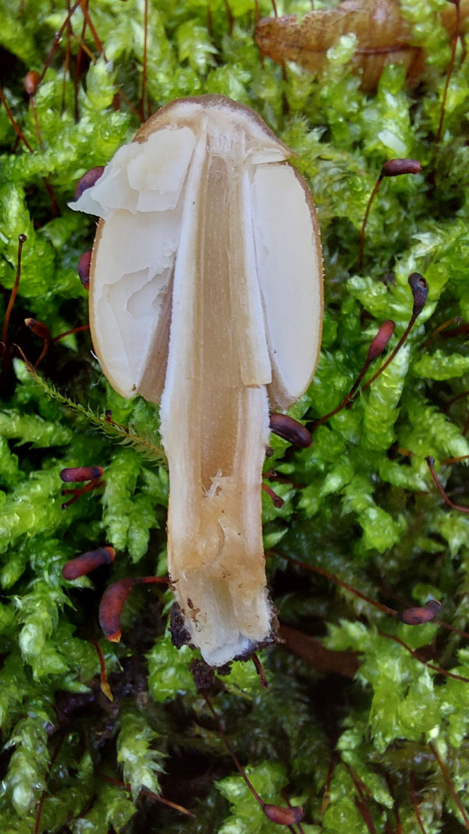 (3) Ein Glimmertintling? Vermutlich der Gemeine (Coprinellus micaceus)? Auf vermodertem Holz im Laubwald gefunden, kein auffälliger Geruch.