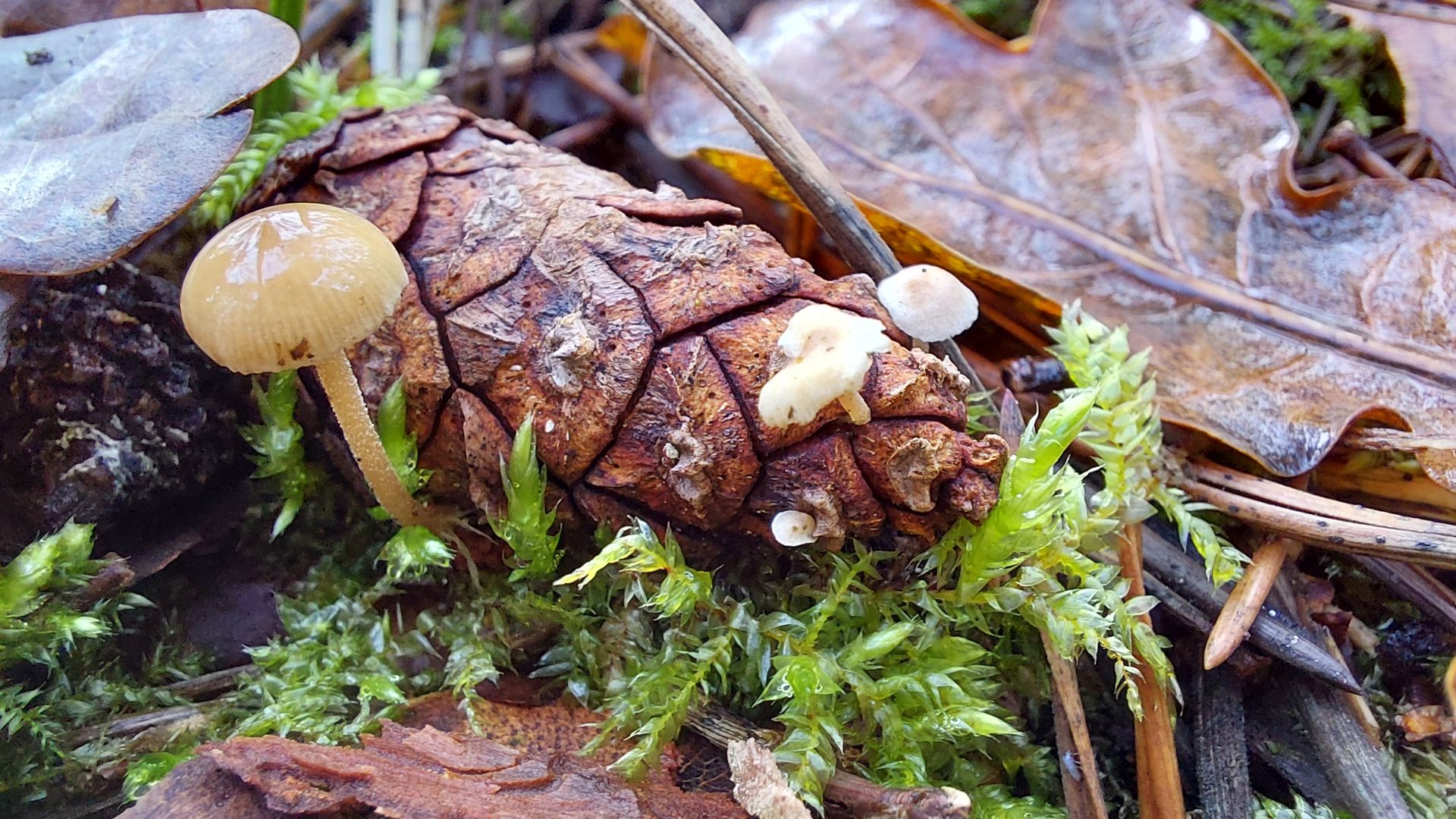 Hier ein Fund vom Februar aus einem Eichen-Kiefern-Mischwald im nördlichen Niedersachsen. Das sollte wohl ein Kiefernzapfen-Rübling sein, auch wenn ich nicht sagen kann, welcher (Strobilurus stephanocystis oder S. tenacellus). Was mich nur verwundert ist, dass ich in verschiedenen Quellen gelesen habe, dass diese beiden Arten, anders als der Fichtenzapfen-Rübling, immer einzeln wachsen, also nicht mehrere Fruchtkörper auf einem Zapfen. Das ist ja aber nicht so bei meinem Fund. Wie sehen da eure Erfahrungen aus? Machen die Kiefernzapfen-Rüblinge da doch manchmal eine Ausnahme und wachsen gesellig? Oder liege ich doch mit meiner Bestimmung falsch?