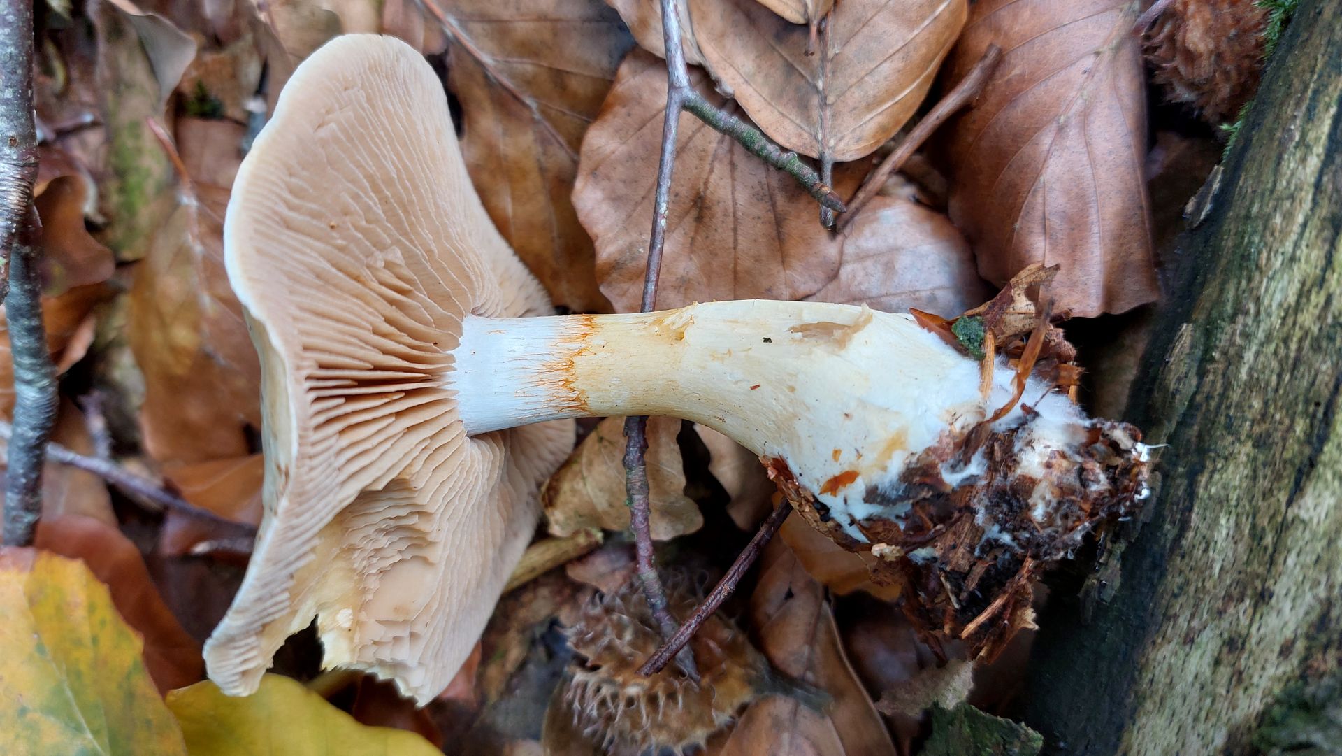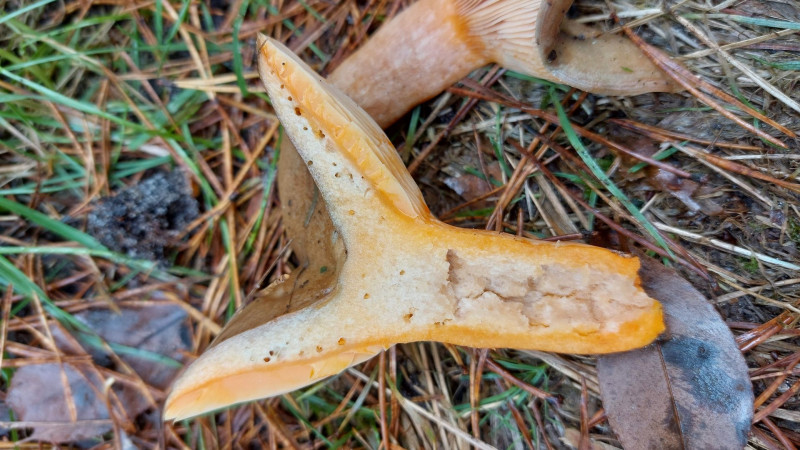 (3) Und zum Abschluß ein Reizker. Grübchen kann ich am Stiel keine erkennen und lande damit beim Fichtenreizker (Lactarius deterrimus). Die Milch verfärbt sich später auch von orange zu weinrot, so wie es sein soll. Nur war weit und breit keine Fichte vor Ort, nur Kiefern mit ein paar eingestreuten Laubbäumen. Nun schreiben zumindest manche Quellen, dass L. deterrimus streng an Fichten gebunden ist. Ist der damit also raus? Wenn ja, welchen Reizker sehr ihr als Alternativkandidaten?