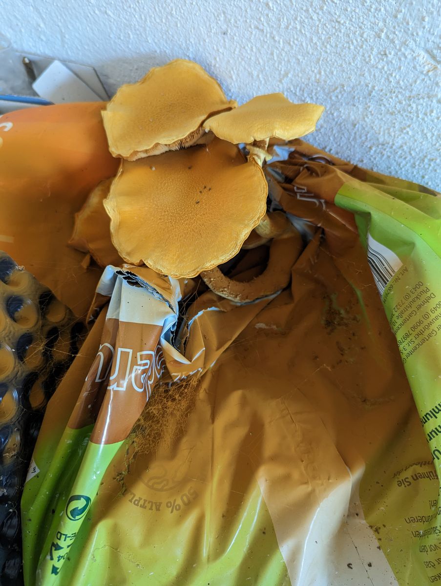und oben jeweils Pilze aus dem Sack. Was sind das für Pilze? Vielleicht könnt ihr mir da helfen. Ich gehe davon aus, den