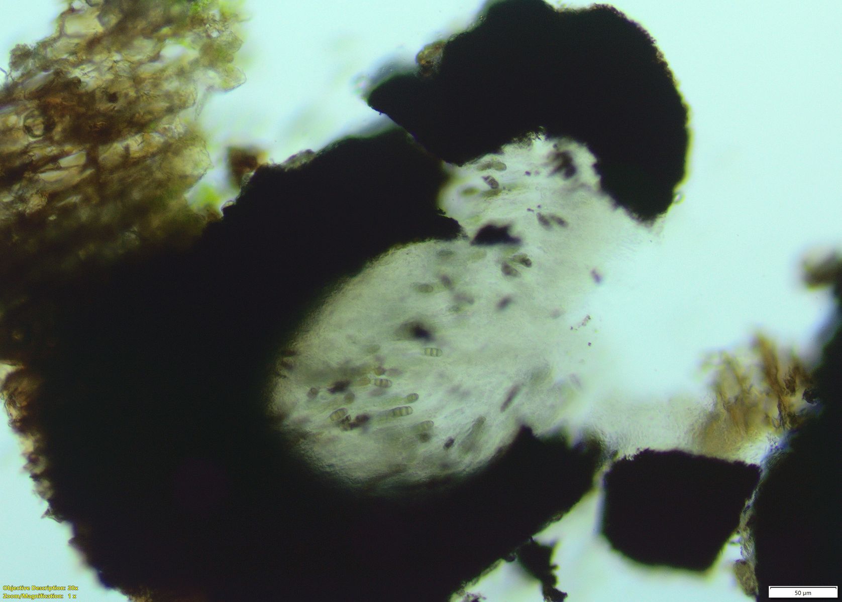 Die Ap sind unbereift und scheinen manchmal von einem grauen Lager umgeben. Beim schlüsseln (nach WHS) komme ich zu Hysterium pulicare u.A. da das Hymenium nicht oberflächlich blau ist. Bei weiterer Beschäftigung dann zu Hysterium angustatum da die Sporengröße deutlich unter der für H. pulicare beschriebenen liegt. In der Umgebung liegen reichlich Algen, insb. auch Trentepohlia sp. (die hier aber im Moment massiv an den Bäumen "blühen") und auch andere Grünalgen sodass ich einen richtigen Flechtenthallus nicht ausmachen kann. Die Ap. sind aber gut von einem grauen Schleier umgeben.