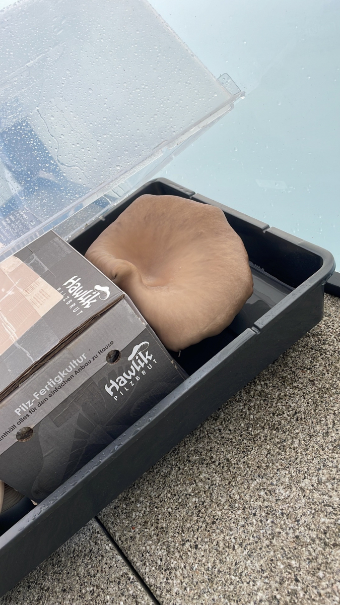In dem ganzen Stress habe ich die Pilzbox auf dem Balkon vergessen, das ist jetzt ca. 3 Wochen her. Ich hab sie mir vor einer Woche nochmal auf dem Balkon angeschaut und wollte sie heute wegwerfen. Als ich sie jetzt angeschaut habe, konnte ich nicht glauben, was ich gesehen habe.