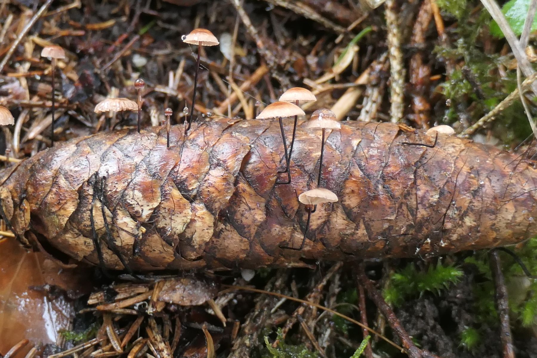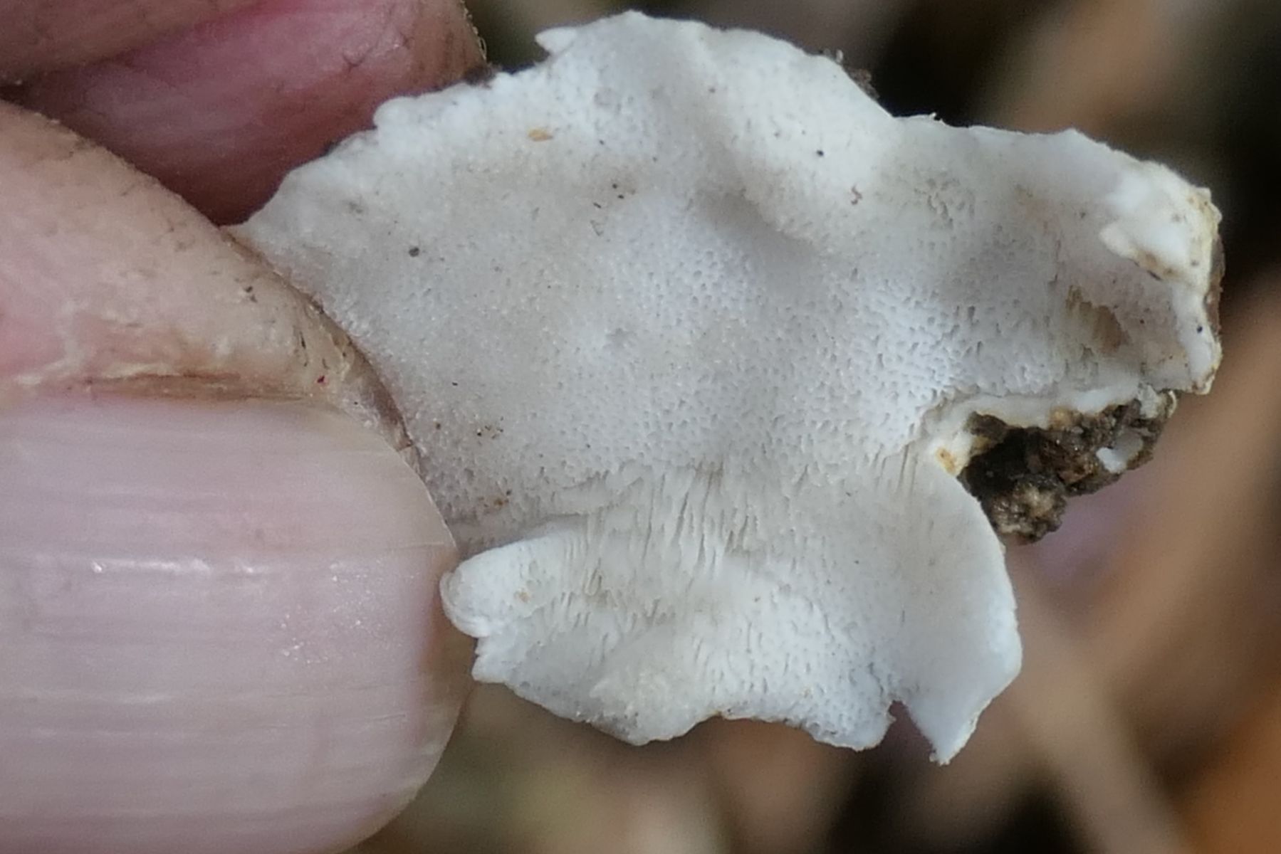 Heute 22.10. auf einer erfolgreichen Totentrompeten Tour bei CH-Safnern BE fielen an der einen Schnittstelle eines gefällten, mächtigen Fichten Stammes diese 'rasig' wachsenden Baumpilzchen mit Poren auf;