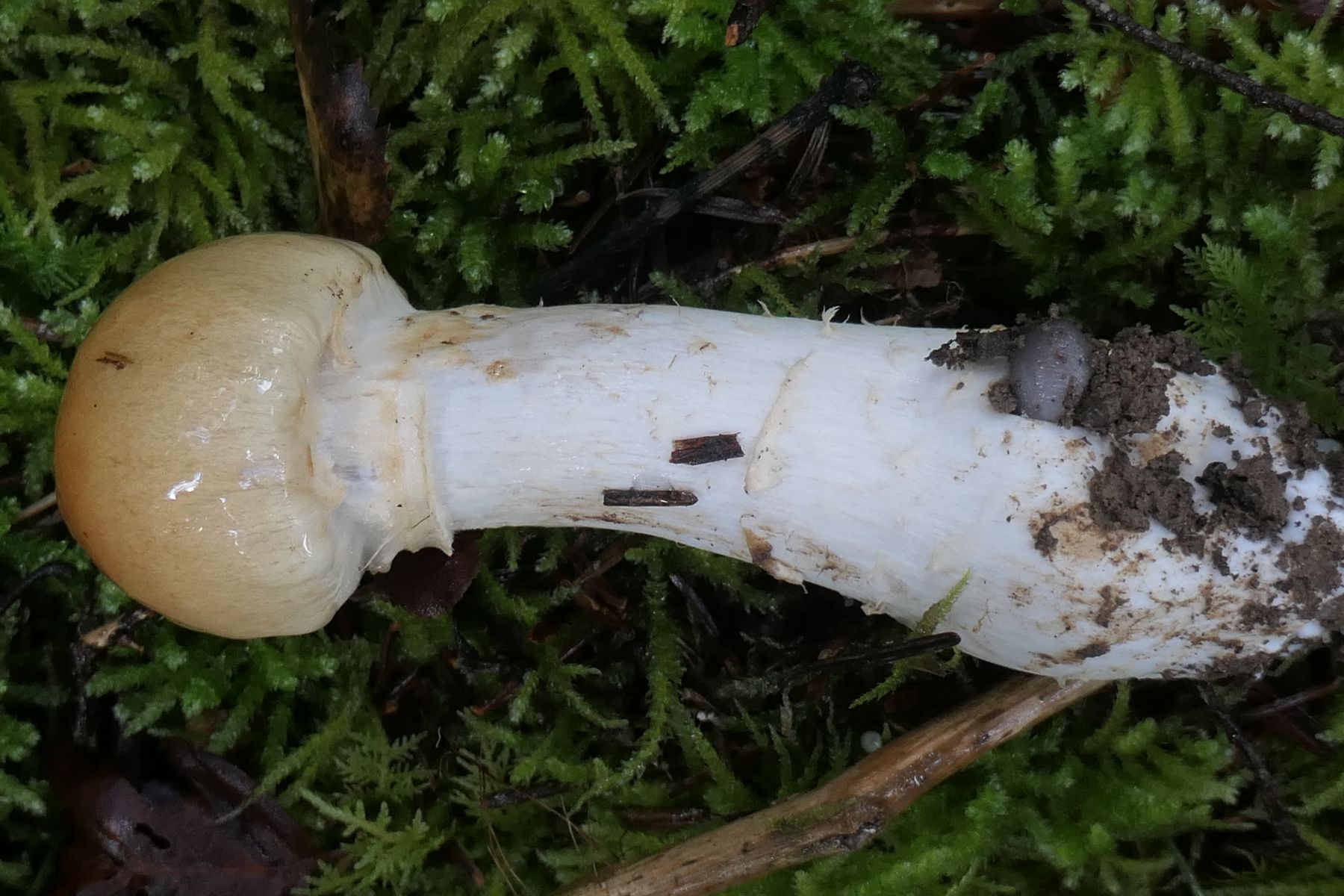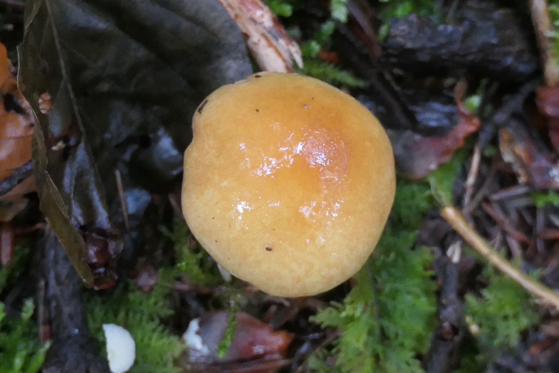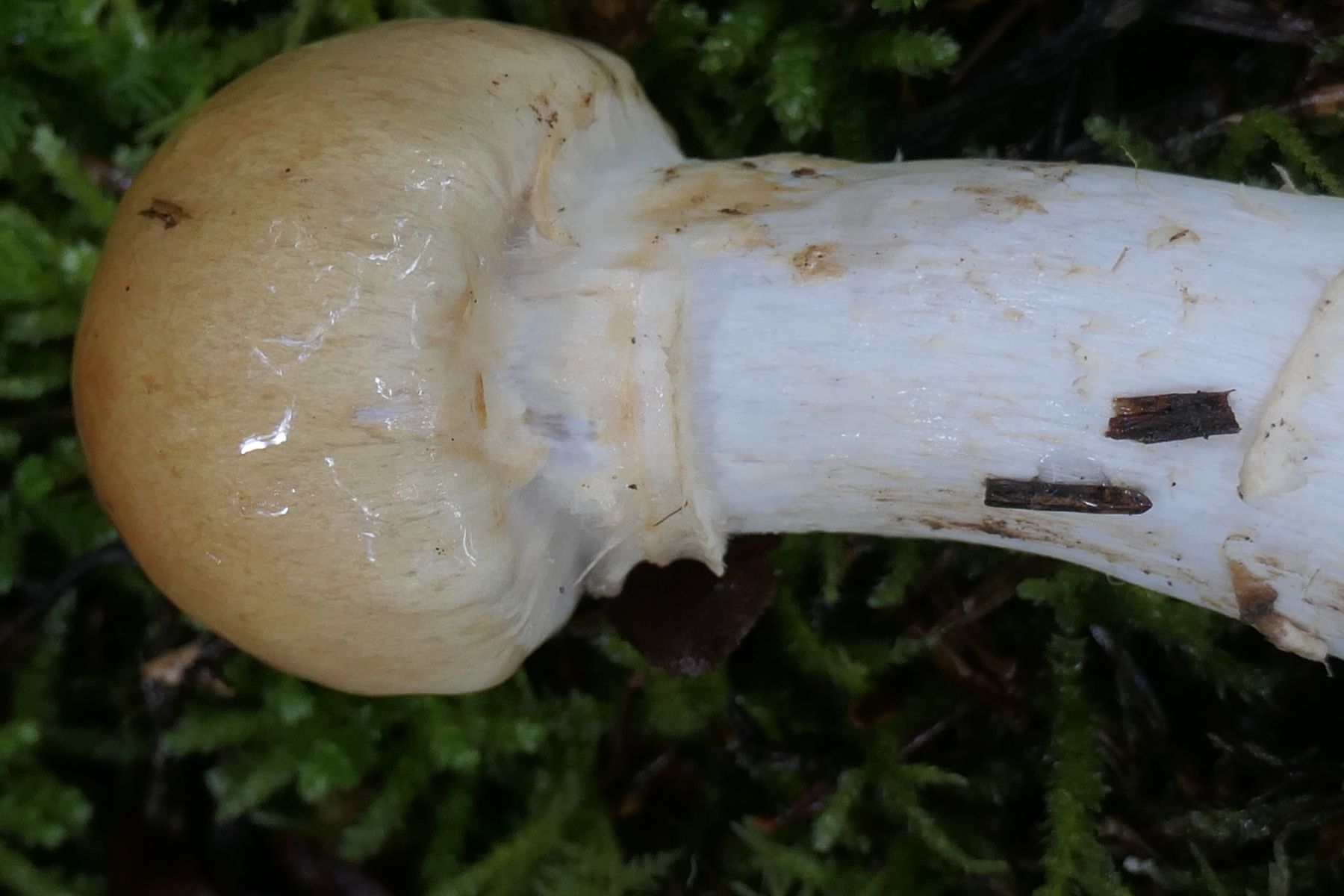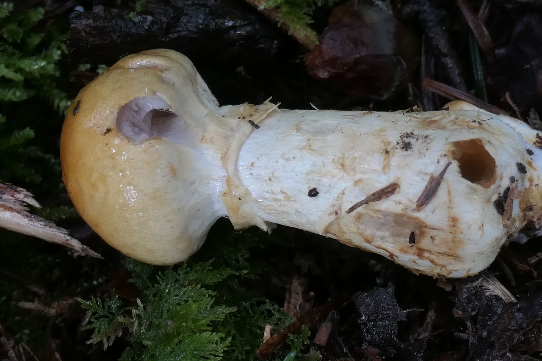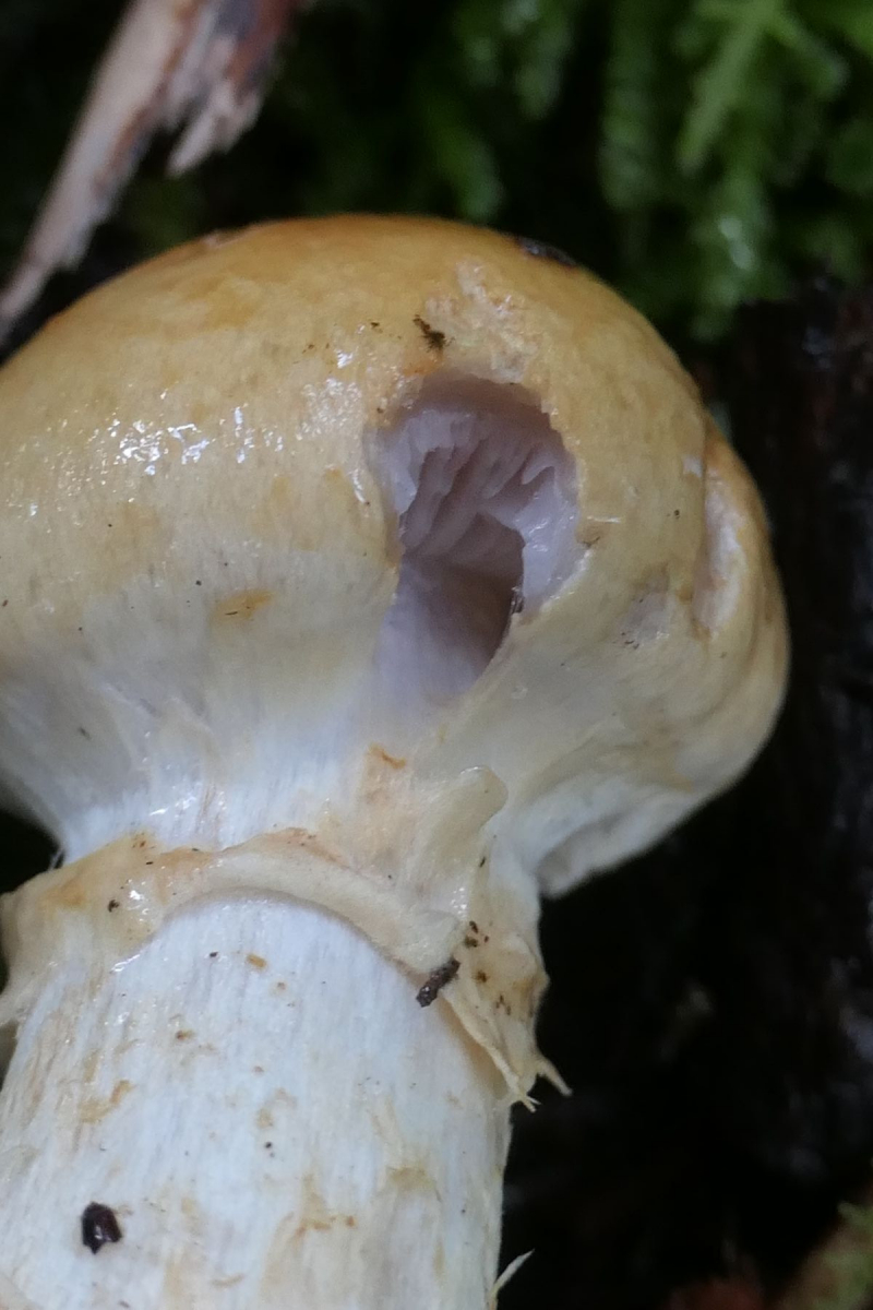 Die zu beobachtenden Merkmale wie gelber, schleimiger Hut mit den knapp sichtbaren, violett getönten Lamellen scheinen zu Abbildungen vom Cortinarius varius zu passen.