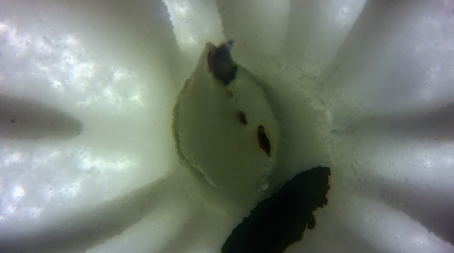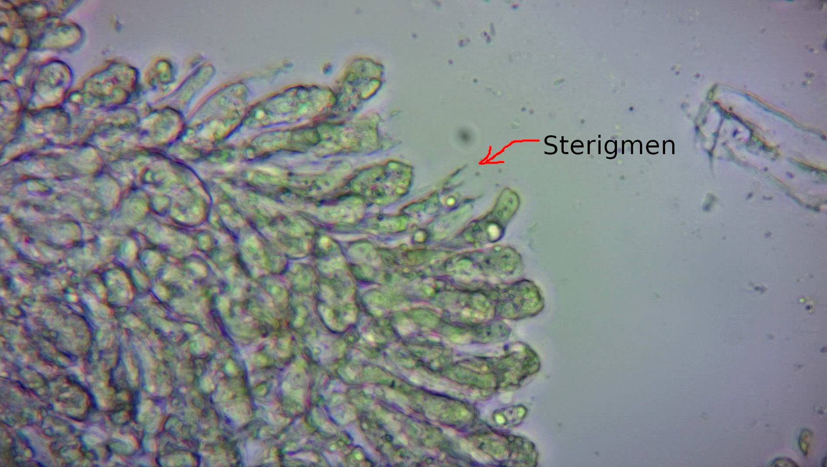 Am unteren Teil des Stiels sieht man unter dem Mikroskop Haare, am ganzen Stiel etwas flockiges, das allerdings auch Verschmutzung sein könnte.