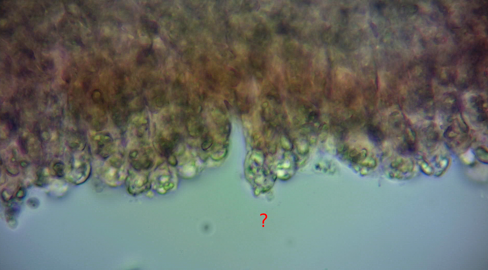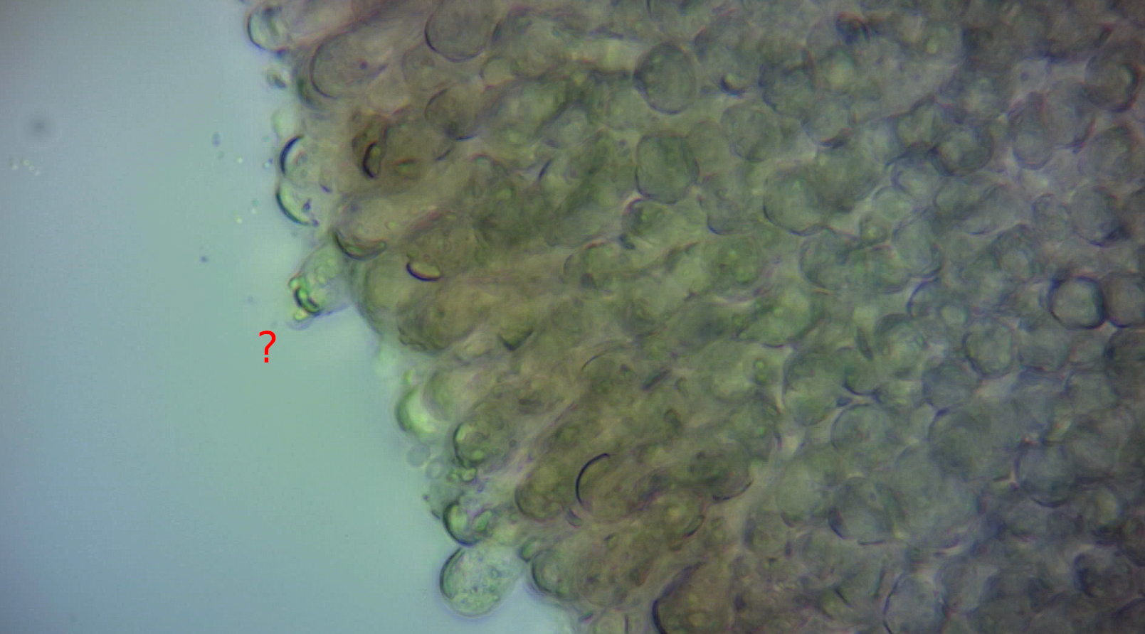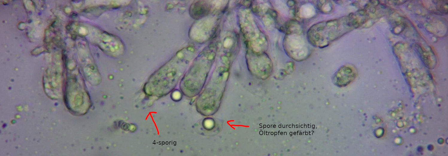 Laut Winkler wäre der Pilz 4-sporig und die Sporen amyloid. Mein Sporenabwurf hat zu einigen wenigen Sporen geführt. Ich hab dann Melzers hinzugegeben und zweimal mit Wasser gespült. Danach habe ich leider keine Sporen mehr gefunden. Vermutlich hab ich diese einfach weggespült. Um die Amyloidität festzustellen, bin ich dann etwas unorthodox vorgegangen. Ich habe einen Hut mit Melzers benetzt, unter dem Wasserhahn abgespült und dann ein Quetschpräparat eines Blatts angefertigt. Eine Spore davon sieht man auf dem folgenden Bild. Die Spore scheint durchsichtig zu sein, höchstens der Öltropfen hat sich verfärbt. Das kann man doch nicht "amyloid" nennen (laut Winkler für Mycena cornyephora zutreffend), oder?