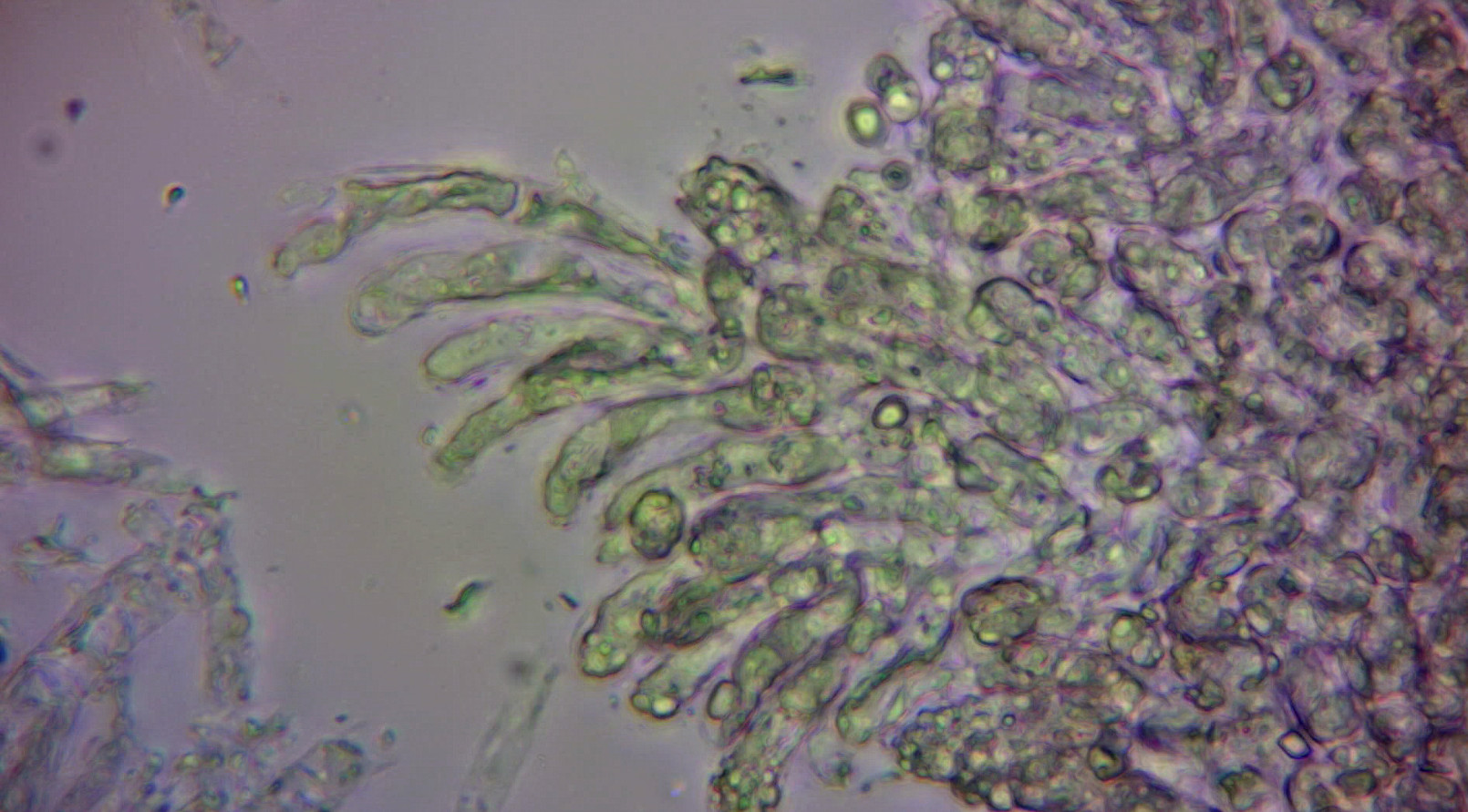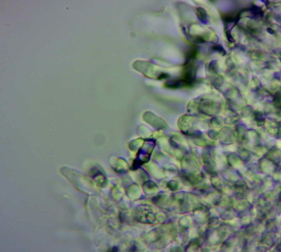 Feinflockigkeit des Hutes und breit angewachsene Blätter kann ich bei so kleinen Fruchtkörpern nur schlecht beurteilen, da ich schon Schwierigkeiten habe, überhaupt etwas zu sehen. Ich hab daher Bilder mit dem Mikroskop gemacht und versucht, durch Brennebenenstapelung ein bißchen Schärfe zu gewinnen.