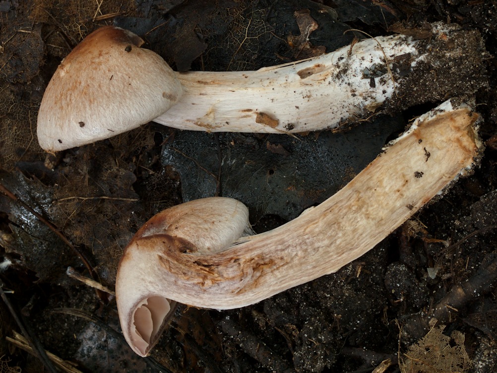 Stiel: 75−85 mm lang, 14−16 mm dick, zylindrisch, basal bis zu 21 mm keulig verdickt, gerade bis geschwungen, Oberfläche matt, grau bis schmutzig gräulich, mit hellgräulichem Velum längs überfasert