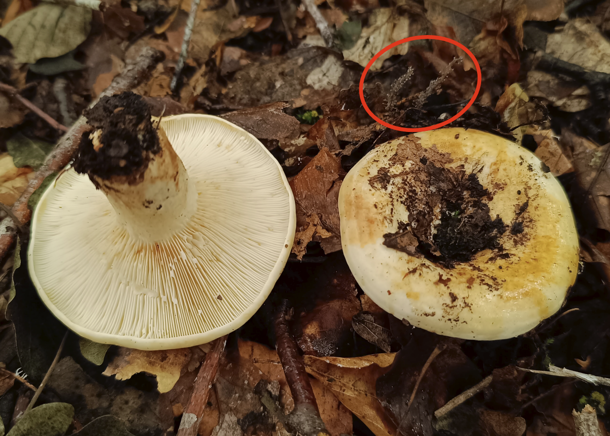 Fleisch: im Hut bis zu 7 mm dick, hellgrau mit ockerfarbener Nuance; im Stiel längsfaserig, voll, basal im Alter etwas schwammig, wie Hutfleisch gefärbt, apikal auch wässrig-dunkelgrau, basal jedoch mehr ockerfarben