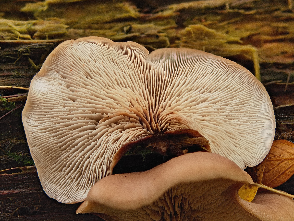 Lamellen: ausgebuchtet angewachsen, mit Zahn marginal herablaufend, bauchig, entfernt stehend, mit Lameletten untermischt, Schneiden glatt, im Alter mit Rissen sowie vereinzelten Scharten und wie die Lamellenfläche zunächst grau, später braun bis orange-braun gefärbt, partiell mit rostfarbenen Sporenpulverablagerungen, beim überalterten Frk. teils weißlich bereift (Schimmelbefall?), hygrophan, ocker ausblassend