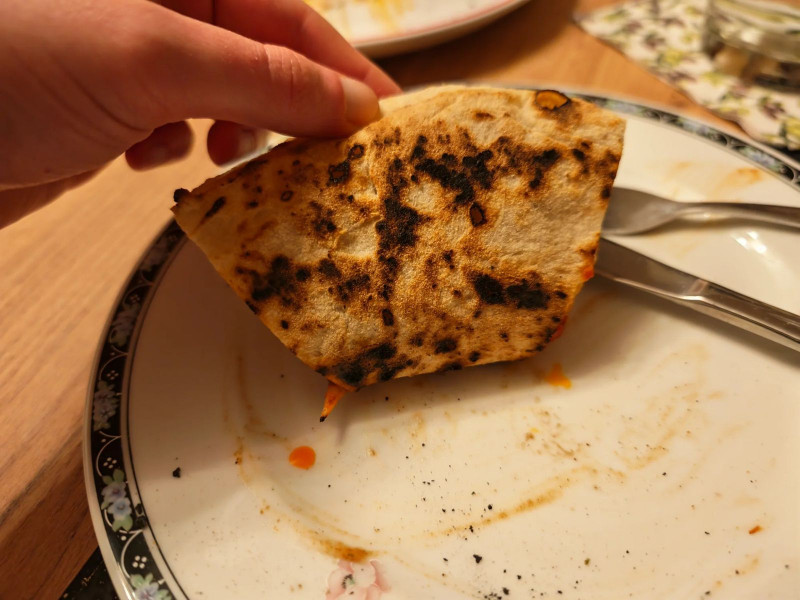 Herbsttrompeten, Frischkäse und Tiroler Speck. Bei der neapolitanischen Calzone kommen Mozzarella und Tomatensauße oben drauf auf einen Einschnitt, was verhindert, dass sich die Tasche zu stark aufbläst.