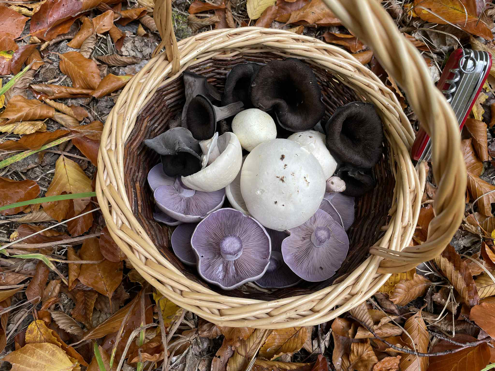 Heute bin ich gegen Mittag zu Fuß in den Hauswald gegangen. Ziel waren eigentlich ein paar Violette Rötelritterlinge fürs Curry zum Abendessen (grünes Kokos-Curry schmeckt mit denen sehr gut). Leider scheinen die jetzt durch zu sein, denn ich konnte kein einziges Exemplar mehr finden. Also wurden halt andere Stellen angesteuert und das Ergebnis war dann doch noch ein recht bunter Korb.