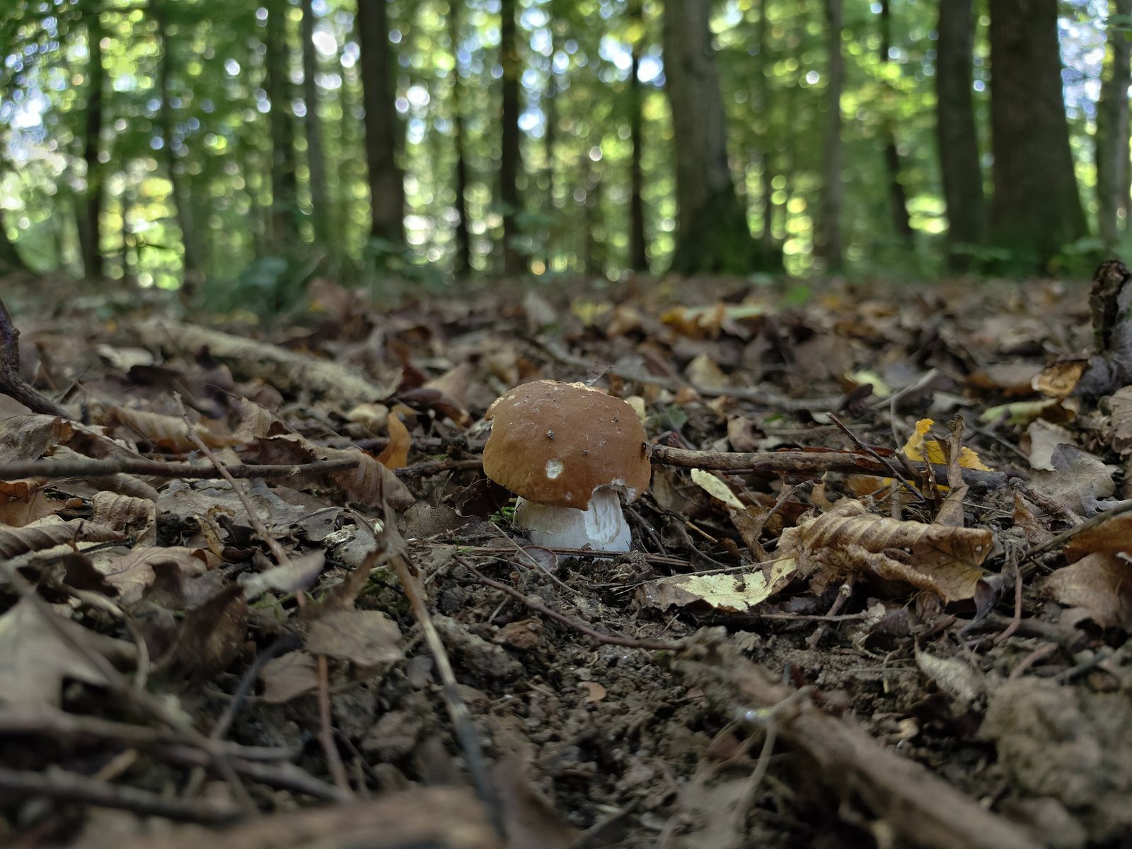 Die gute Stelle war bei einem kleinen Kiefernwäldchen mit eingestreuten Eichen. Bei den guten Fichten Spots schauen erst sehr vereinzelt Hutspitzen aus der Streu.