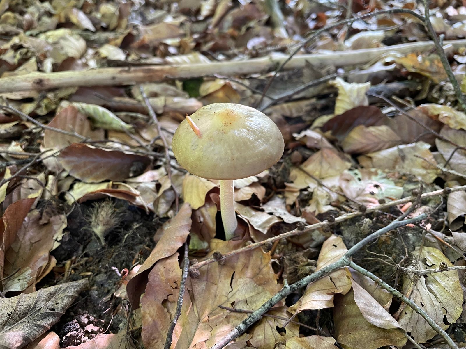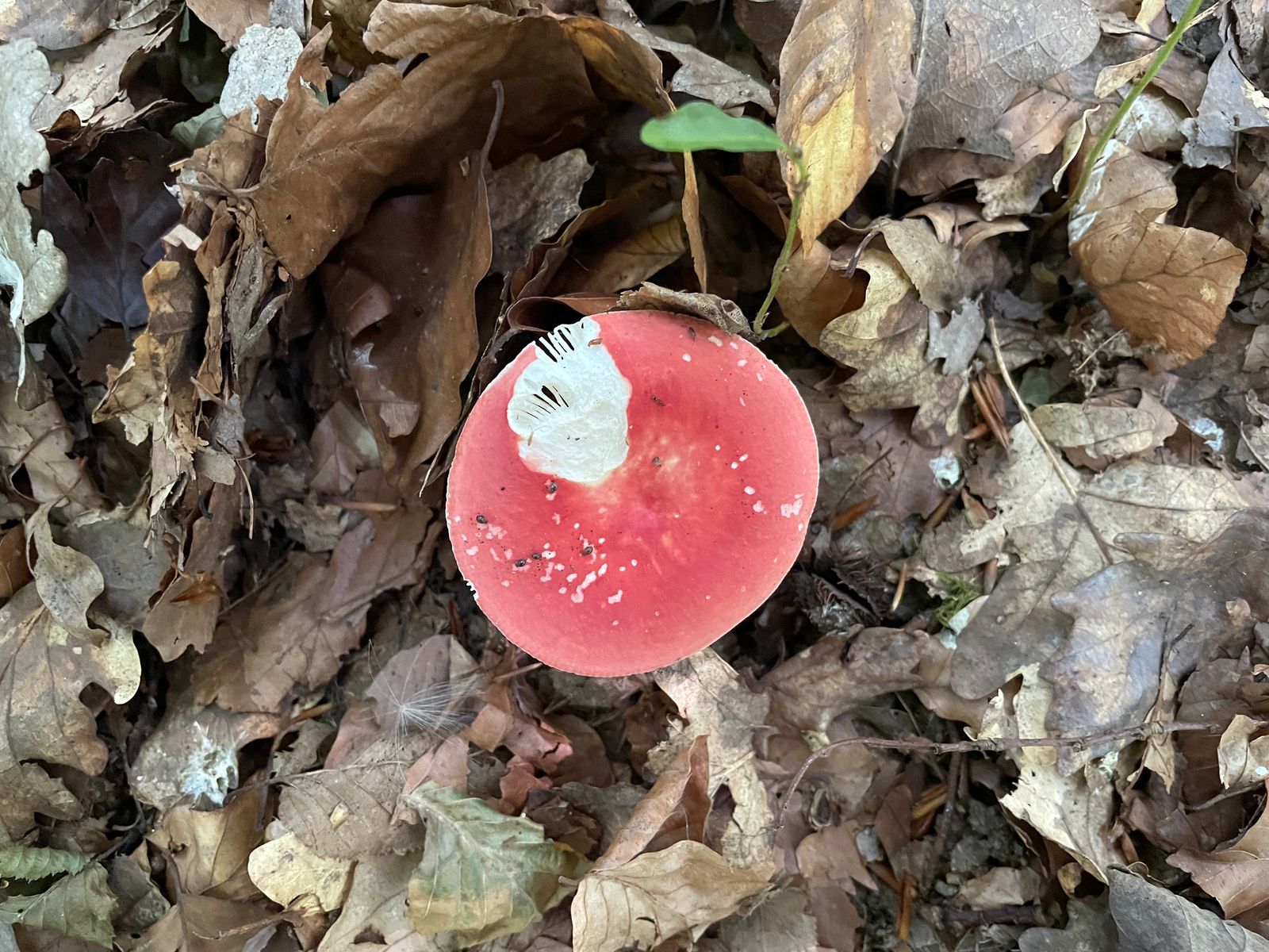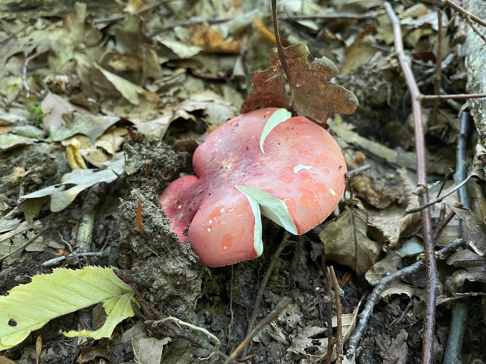 Ein extrem intensiver Farbtupfer hat aus dem Laub gespitzelt. Irgendwas von den Heringstäublingen, dem Geruch nach zu Urteilen. Oder der Zustand ist dran schuld.
