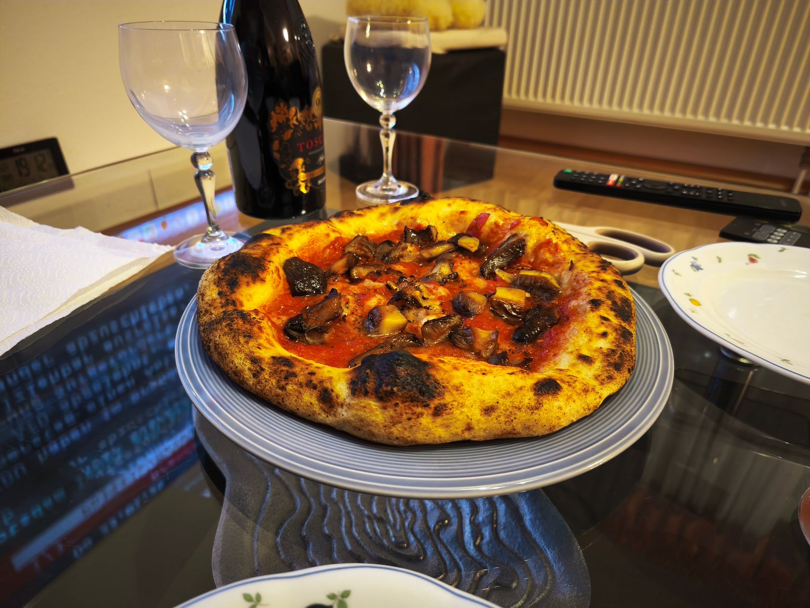 Ich habe die Pilzhüte abgebürstet und eine Pfanne mit etwas Sesamöl angesetzt. Die Pilzhüte wurden zunächst mit den Lamellen nach unten gebraten und dabei mit einem Topf angedrückt. Ziel: Guter Pfannenkontakt und schnelleres Austreiben des recht hohen Wassergehalts der Art. Nach 7 Minuten braten von einer Seite wurden die Pilze gewendet und nochmals (wieder angedrückt) auf der Hutseite 7 Minuten gebraten. Das Ergebnis ist dann eine schöne goldbraune Farbe.