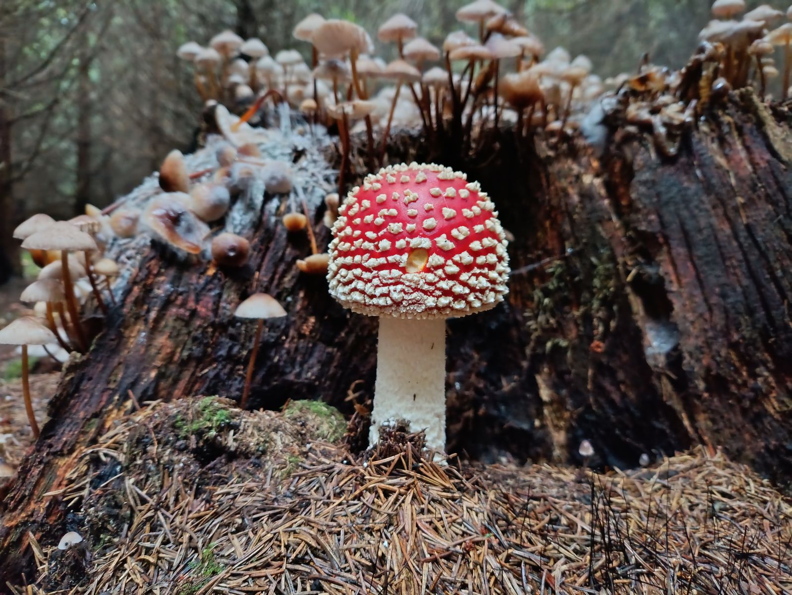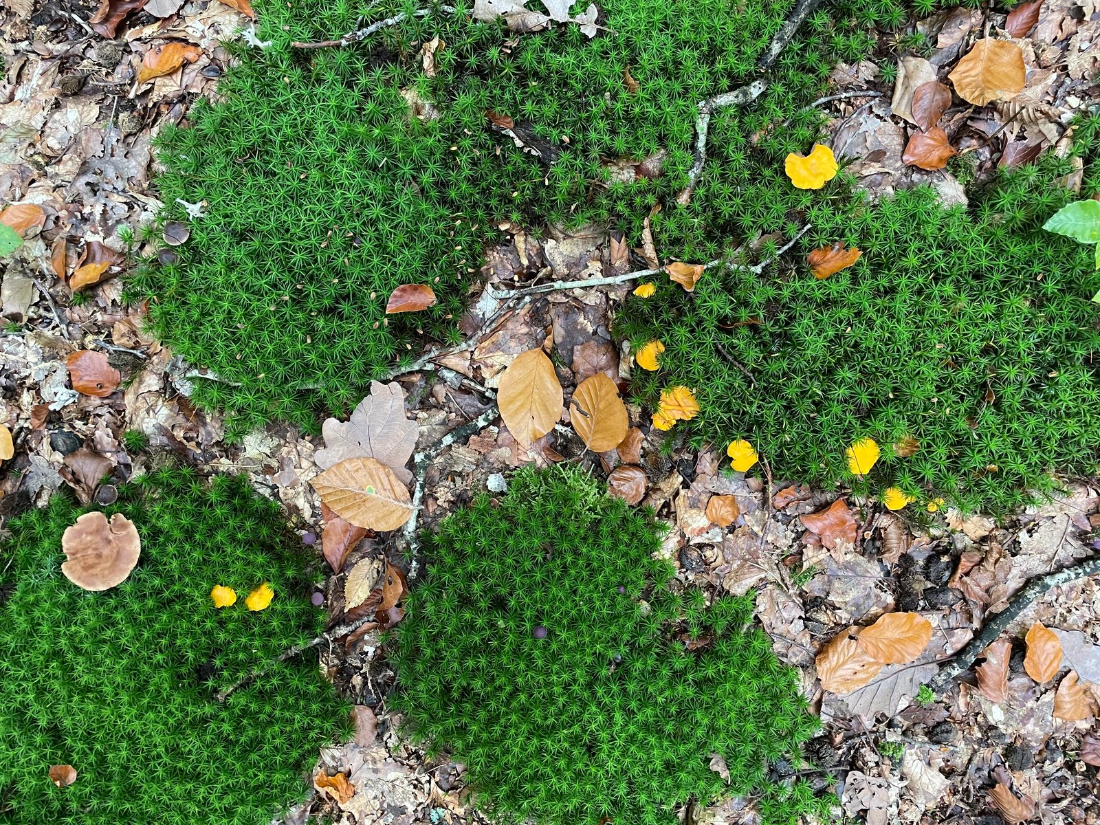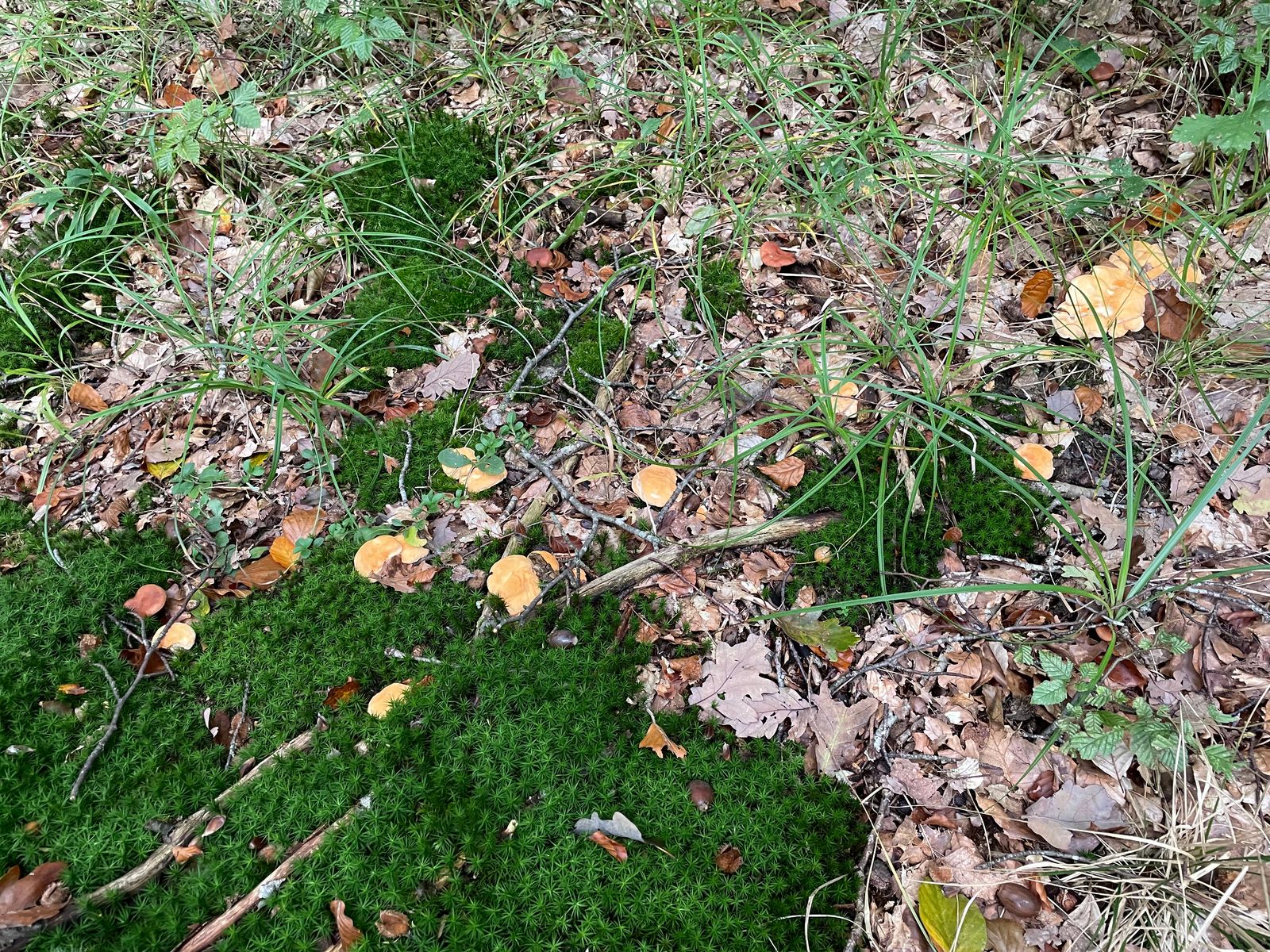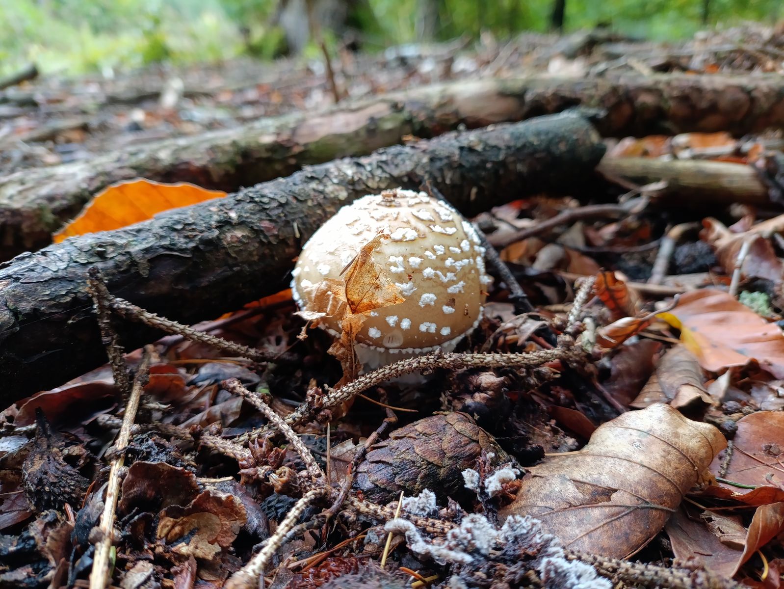 Bei den Fliegenpilzen klingt das Massenwachstum langsam aus. Hier und da finden sich aber auch noch junge Fruchtkörper. Im Hintergrund hat es was Interessantes, das mir erst auf dem Foto zu Hause aufgefallen ist. Könnte das der echte Knoblauchschwindling sein? Ich glaube, da muss ich nochmal hin... sofern der Schimmel bis zur nächsten Runde was davon übrig lässt.