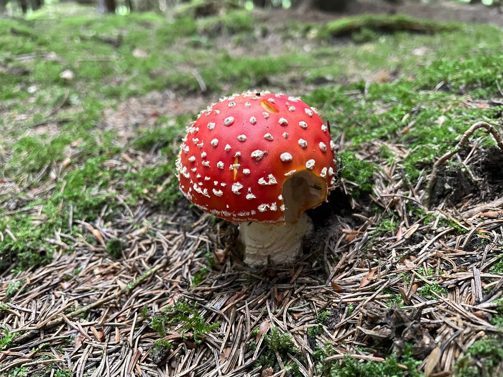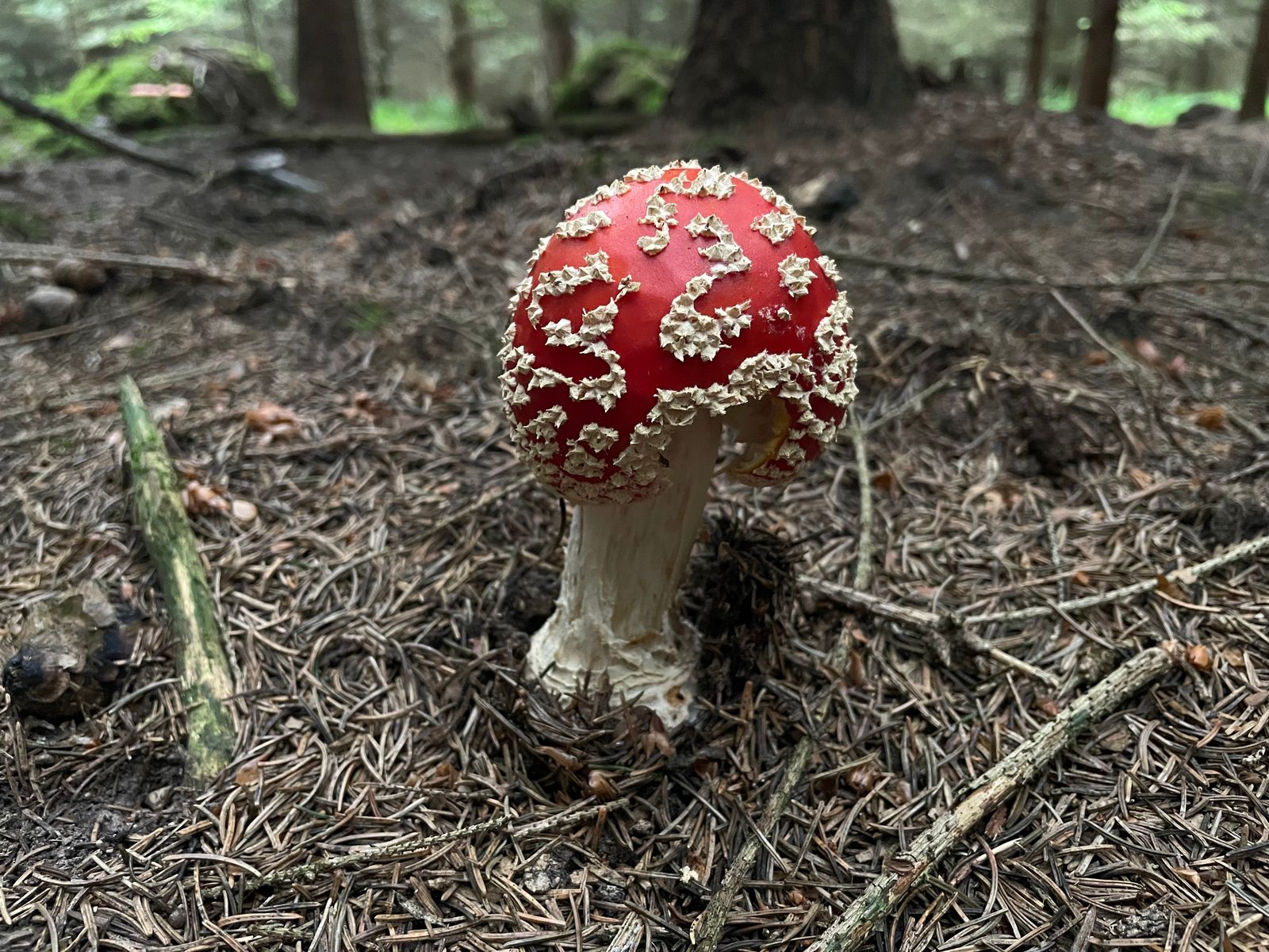 Die Fliegenpilze schieben auch mit frischen Fruchtkörpern nach. Wunderschön.