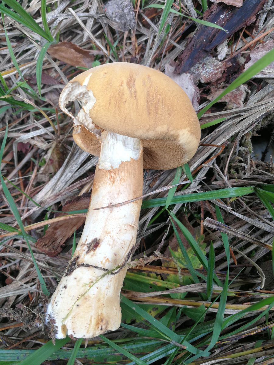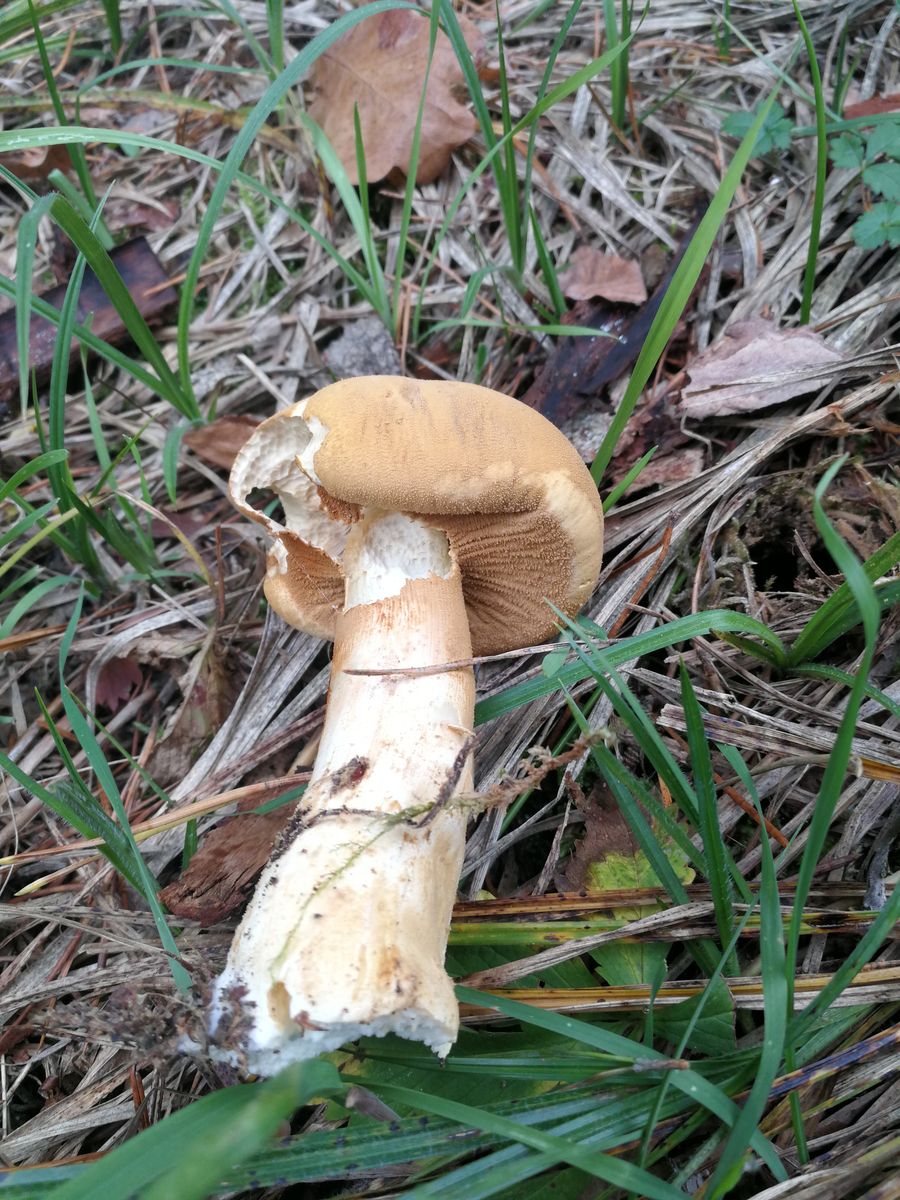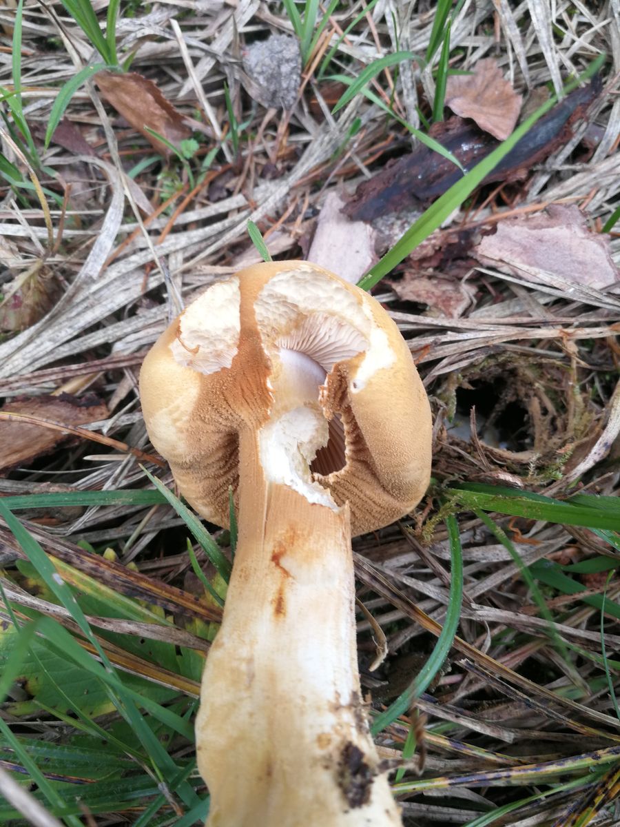 Der Hut hat einen pulvrigen Reif, welcher auch auch dem Velum zu finden ist. Stiel war brüchig, aufgrund der Eile mit den Kids konnte ich die Stielbasis nicht rauspopeln. Es war ein Einzelexemplar.