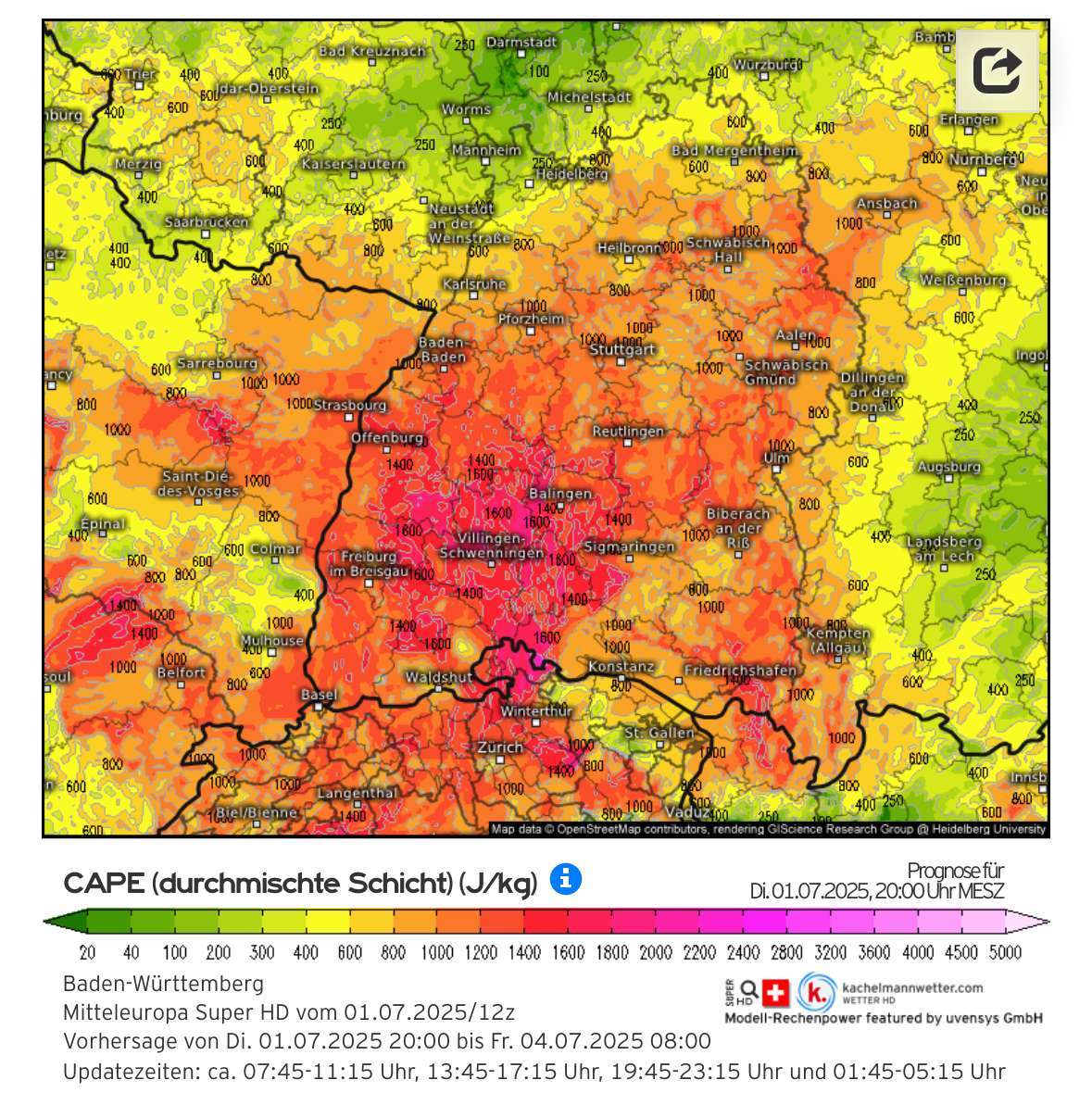 Ist der CAPE-Wert (verfügbare Gewitterenergie) hoch genug, können tatsächlich spontan und ohne Vorwarnung Gewitter entstehen. Sieht man sich diese Karte an, kann es in großen Teilen von BaWü jederzeit krachen, das lässt sich selbst mit modernsten meteorologischen Mitteln unmöglich vorhersagen, wo es knallen wird.