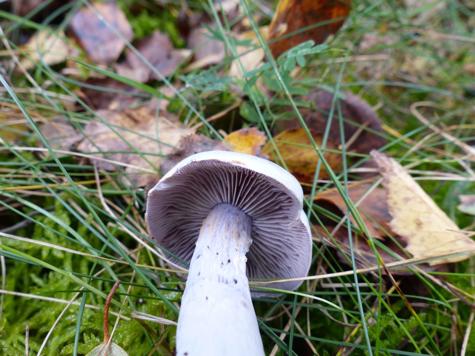Der Fuß war wie eine Keule, und gab auf ein wenig Druck nach. An der Stielspitze zum Hut hin sah ich so rostbraunes Gewirre. So wie Haare oder Fell. Er war im Moos ein wenig tiefer vergraben. Die Lamellen sind untermischt, der Hut ein wenig "glockig" und auch hier ist das Lila schwach.