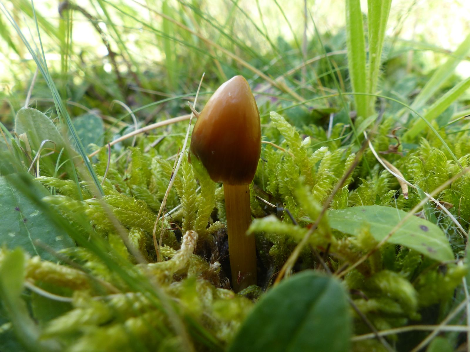 Ich fand ihn auf einer Wiese, zwischen Moos und Gras. Sein Hut fühlte sich an, wie wenn Gel drauf wäre. Die Spitze des Hutes ist heller, fast weiß. Der Stiel gelb; die Stielspitze rot. Klein ist er, sehr klein. Ich hätte ihn fast nicht gesehen.