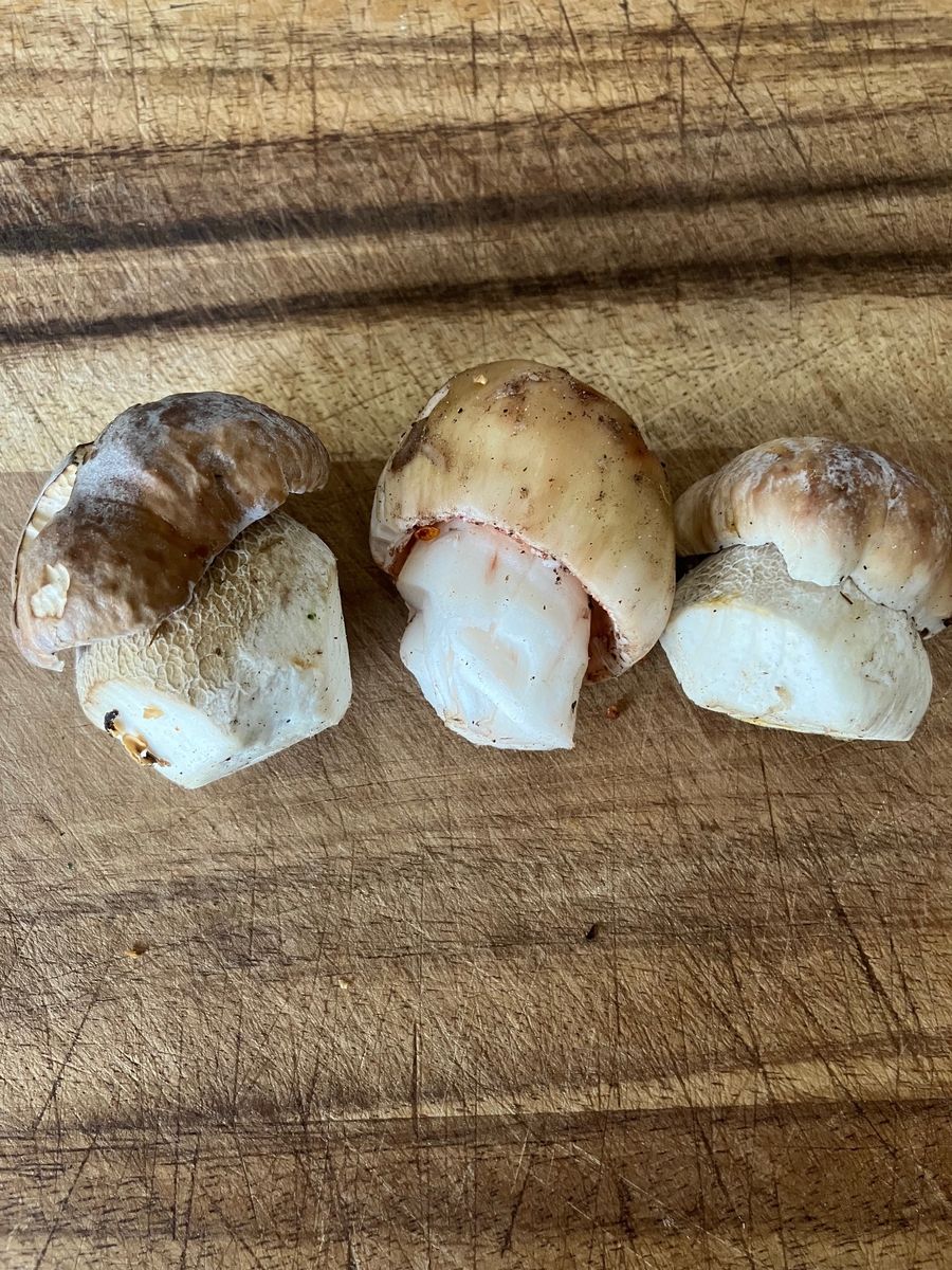 du hattest schon gesehen, dass das nicht nur Steinpilze sind, oder? Der mittlere der drei ist jedenfalls ein Perlpilz.