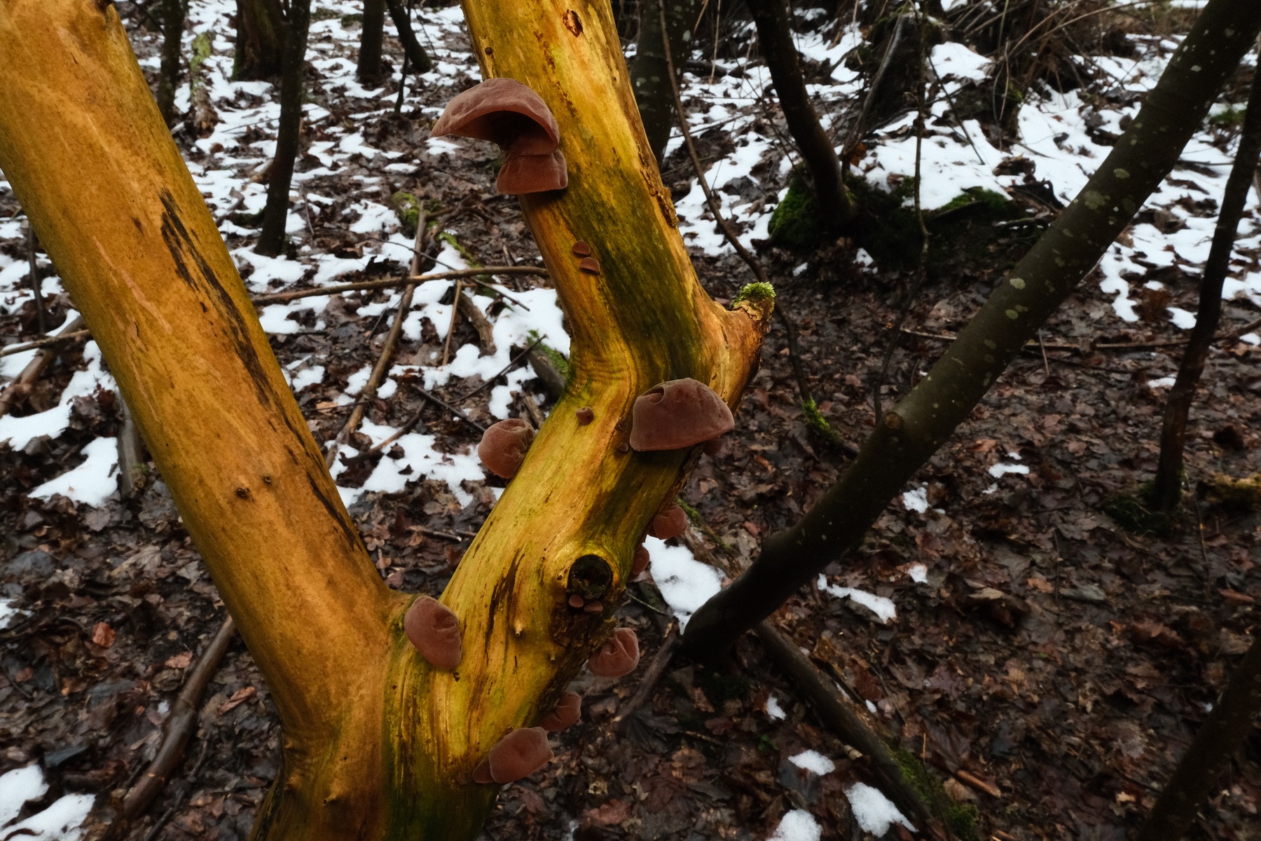 Durch den getauten Schnee und die ca. 10 Liter Regen ist noch alles nass, sodass die Bedingungen für ein paar Winterpilze am WE passen sollten.