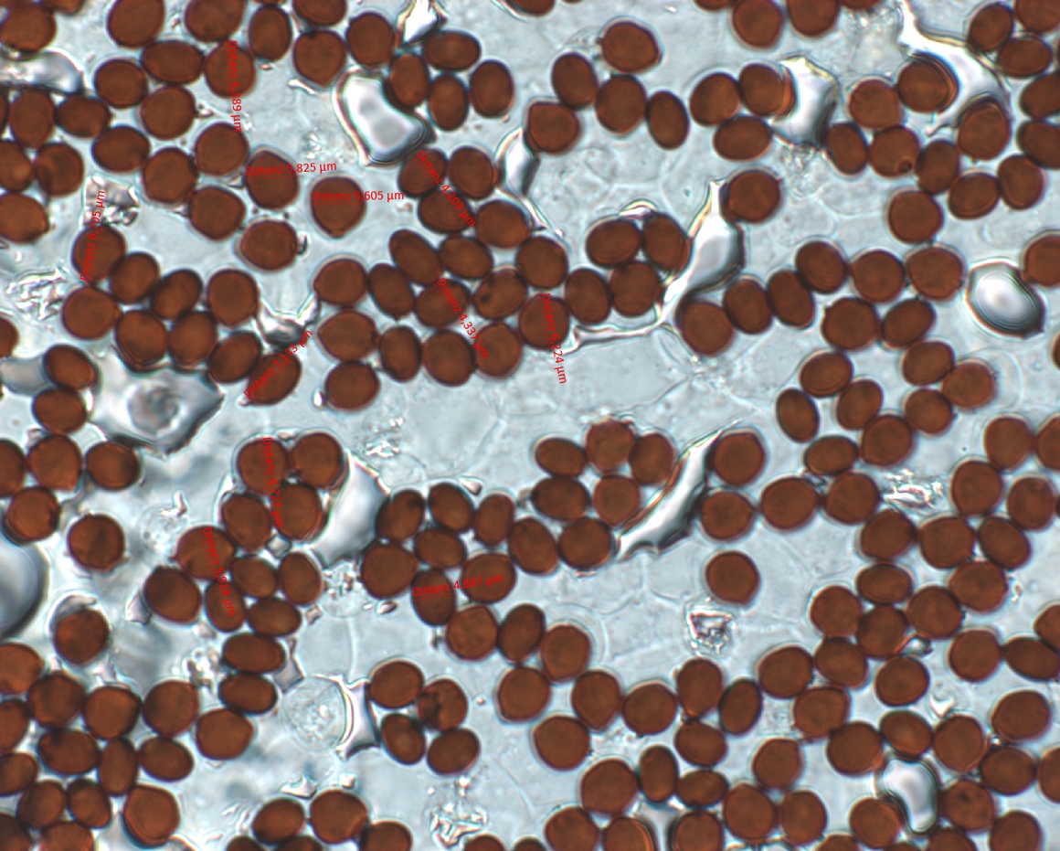 Habe diesen Coprinus auf meinem Pferdedung gefunden; Sporengröße: 6,2-7,1 x 4,6-5,9 Mikrometer, Basidiengröße: (nur eine Basidie gefunden) 16 x 7 Mikrometer, 4-sporig